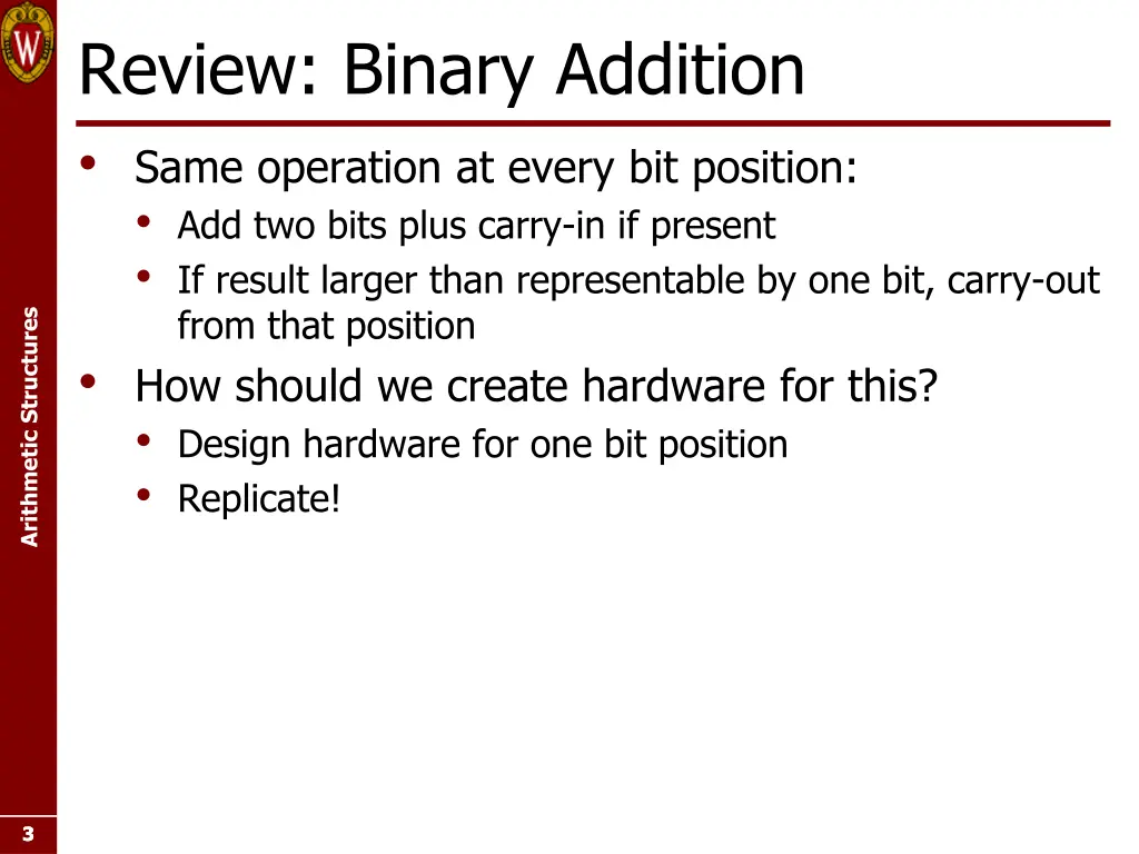 Review: Binary Addition Same operation at every bit position: Add two bits plus carry-in if present If result larger than representable by one bit, carry-out from that position How should we create hardware for this? Design hardware for one bit position Replicate! Arithmetic Structures 3 3 3