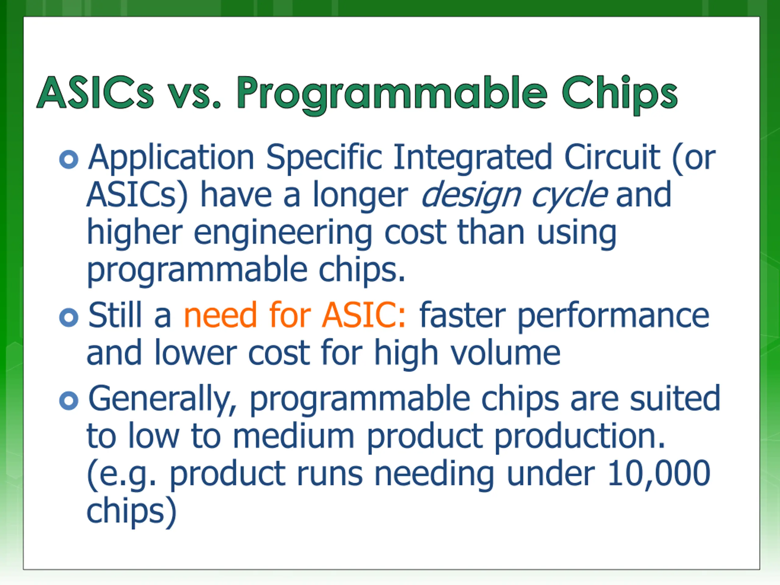 ASICs vs. Programmable Chips Application Specific Integrated Circuit (or ASICs) have a longer design cycle and higher engineering cost than using programmable chips. Still a need for ASIC: faster performance and lower cost for high volume Generally, programmable chips are suited to low to medium product production. (e.g. product runs needing under 10,000 chips)