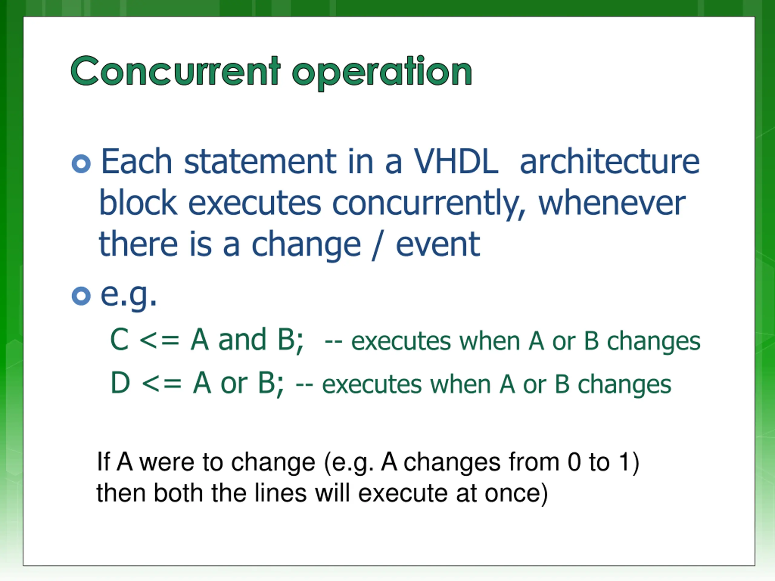 Concurrent operation Each statement in a VHDL architecture block executes concurrently, whenever there is a change / event e.g. C <= A and B; -- executes when A or B changes D <= A or B; -- executes when A or B changes If A were to change (e.g. A changes from 0 to 1) then both the lines will execute at once)
