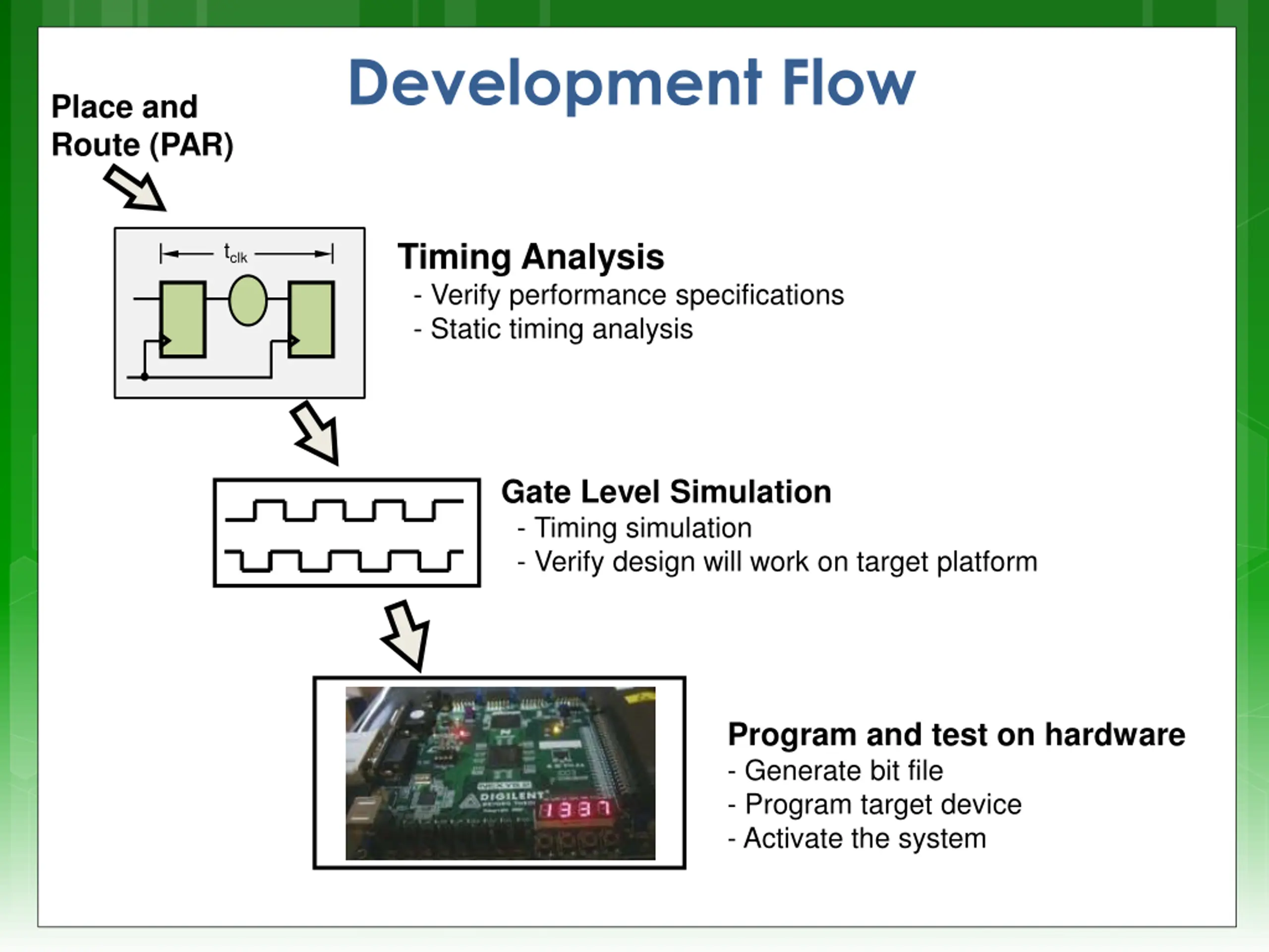 Development Flow Place and Route (PAR) Timing Analysis - Verify performance specifications - Static timing analysis tclk Gate Level Simulation -Timing simulation - Verify design will work on target platform Program and test on hardware - Generate bit file - Program target device - Activate the system