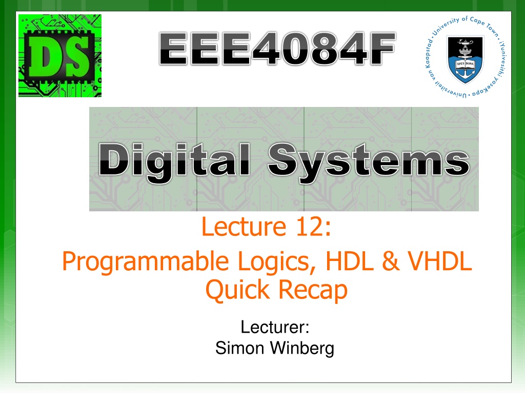 EEE4084F EEE4084F Digital Systems Digital Systems Lecture 12: Programmable Logics, HDL & VHDL Quick Recap Lecturer: Simon Winberg