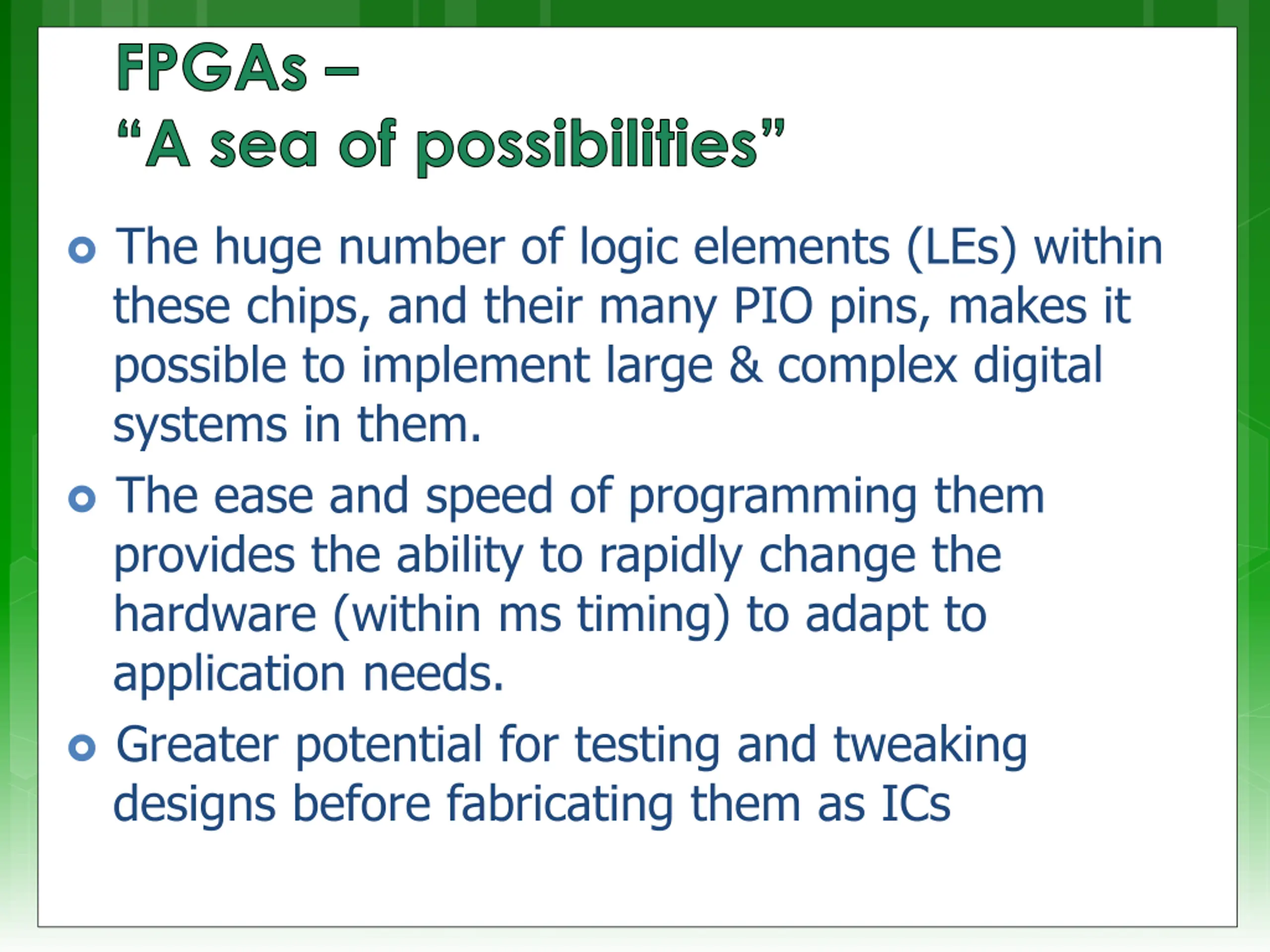 FPGAs A sea of possibilities The huge number of logic elements (LEs) within these chips, and their many PIO pins, makes it possible to implement large & complex digital systems in them. The ease and speed of programming them provides the ability to rapidly change the hardware (within ms timing) to adapt to application needs. Greater potential for testing and tweaking designs before fabricating them as ICs