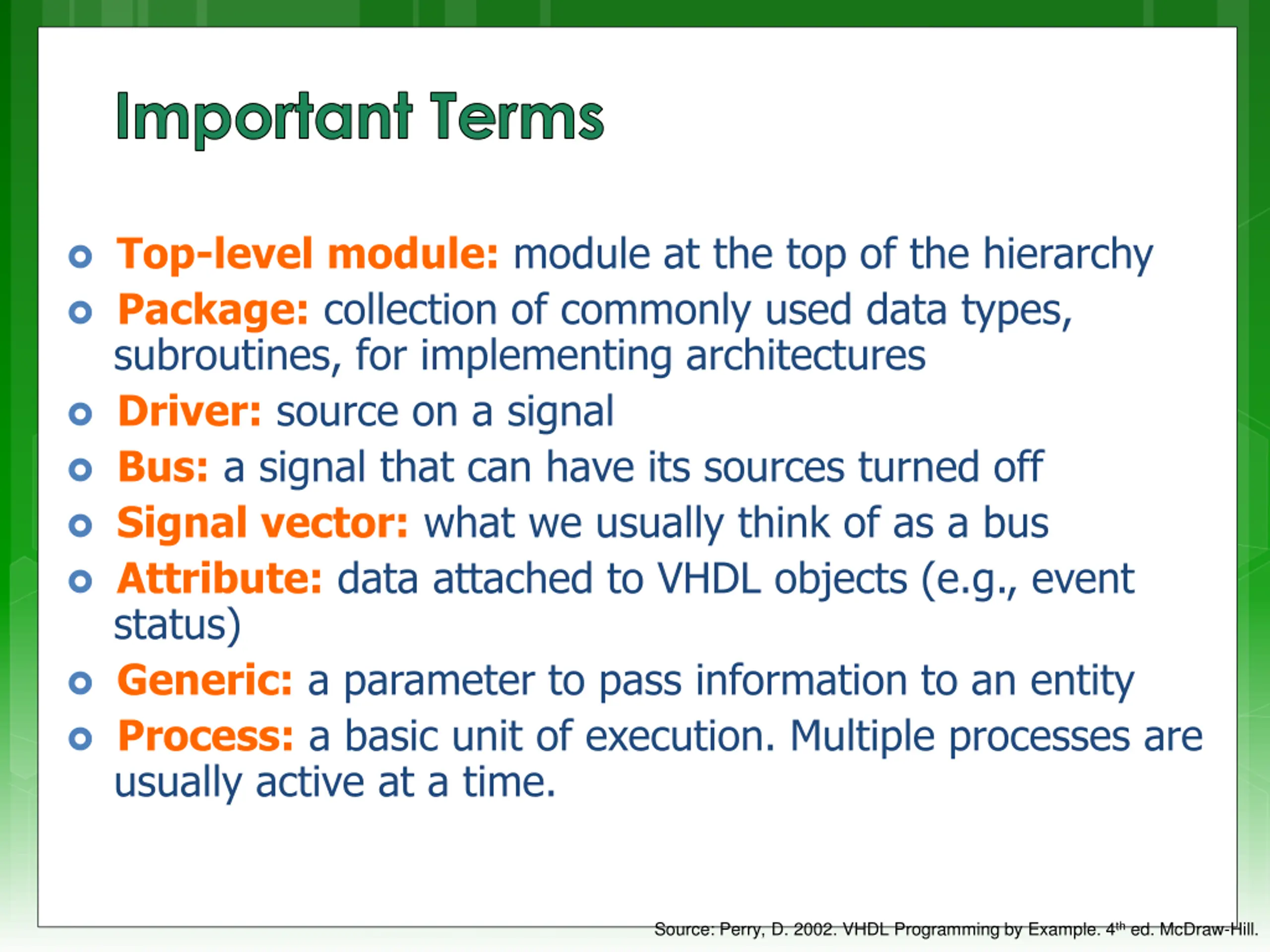 Important Terms Top-level module: module at the top of the hierarchy Package: collection of commonly used data types, subroutines, for implementing architectures Driver: source on a signal Bus: a signal that can have its sources turned off Signal vector: what we usually think of as a bus Attribute: data attached to VHDL objects (e.g., event status) Generic: a parameter to pass information to an entity Process: a basic unit of execution. Multiple processes are usually active at a time. Source: Perry, D. 2002. VHDL Programming by Example. 4th ed. McDraw-Hill.