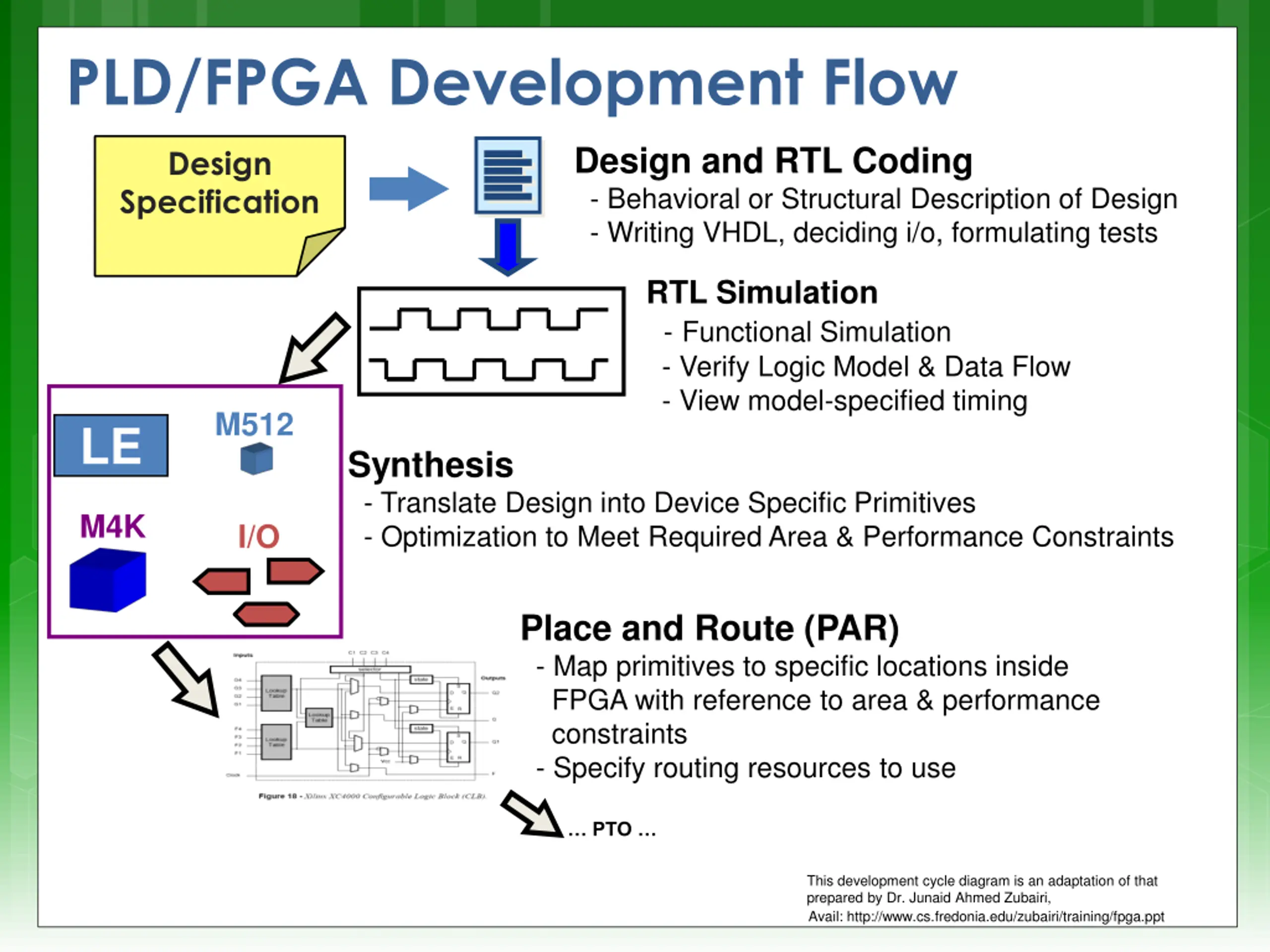 PLD/FPGA Development Flow Design and RTL Coding - Behavioral or Structural Description of Design - Writing VHDL, deciding i/o, formulating tests Design Specification RTL Simulation -Functional Simulation - Verify Logic Model & Data Flow - View model-specified timing M512 LE Synthesis - Translate Design into Device Specific Primitives - Optimization to Meet Required Area & Performance Constraints M4K I/O Place and Route (PAR) - Map primitives to specific locations inside FPGA with reference to area & performance constraints - Specify routing resources to use PTO This development cycle diagram is an adaptation of that prepared by Dr. Junaid Ahmed Zubairi, Avail: http://www.cs.fredonia.edu/zubairi/training/fpga.ppt