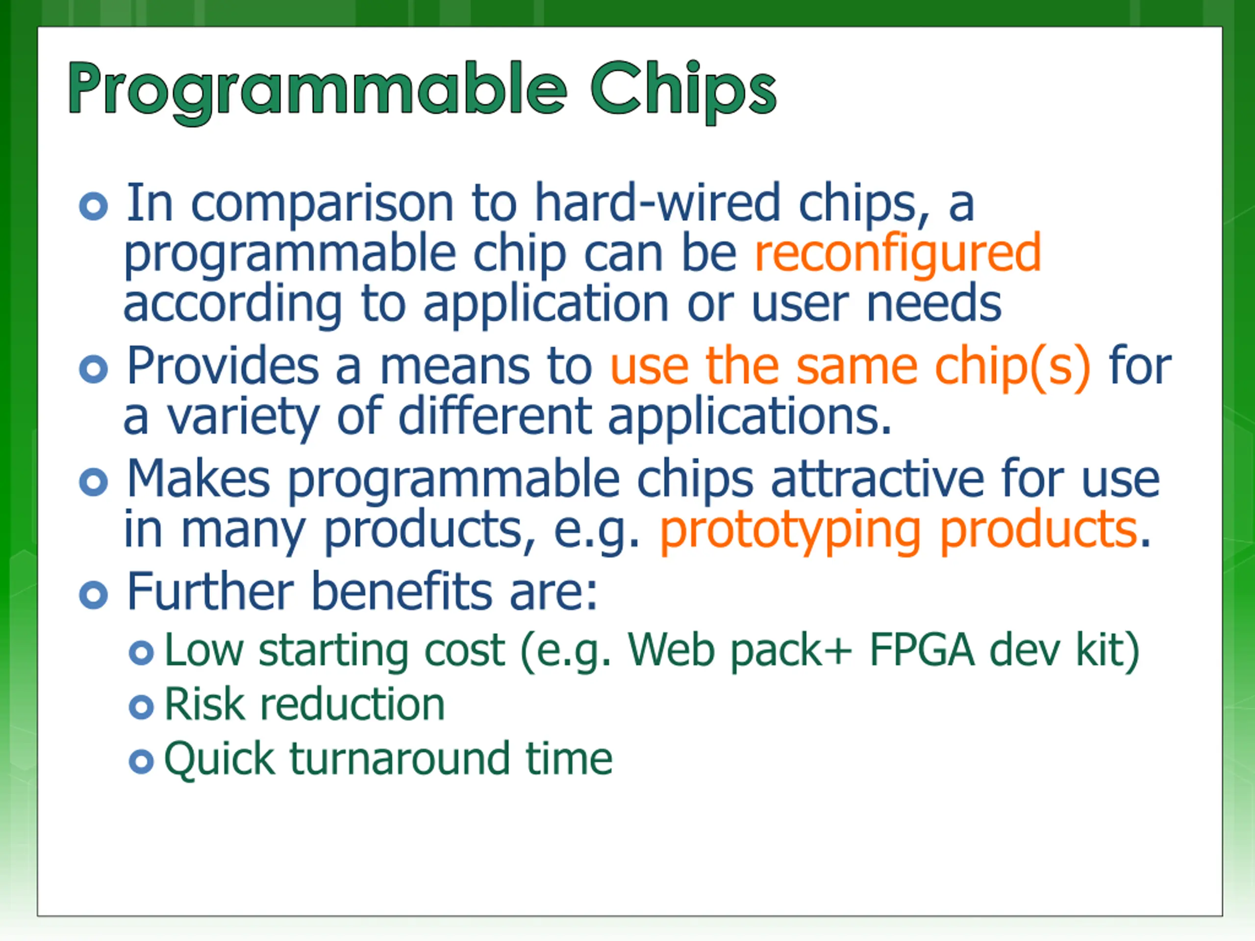 Programmable Chips In comparison to hard-wired chips, a programmable chip can be reconfigured according to application or user needs Provides a means to use the same chip(s) for a variety of different applications. Makes programmable chips attractive for use in many products, e.g. prototyping products. Further benefits are: Low starting cost (e.g. Web pack+ FPGA dev kit) Risk reduction Quick turnaround time