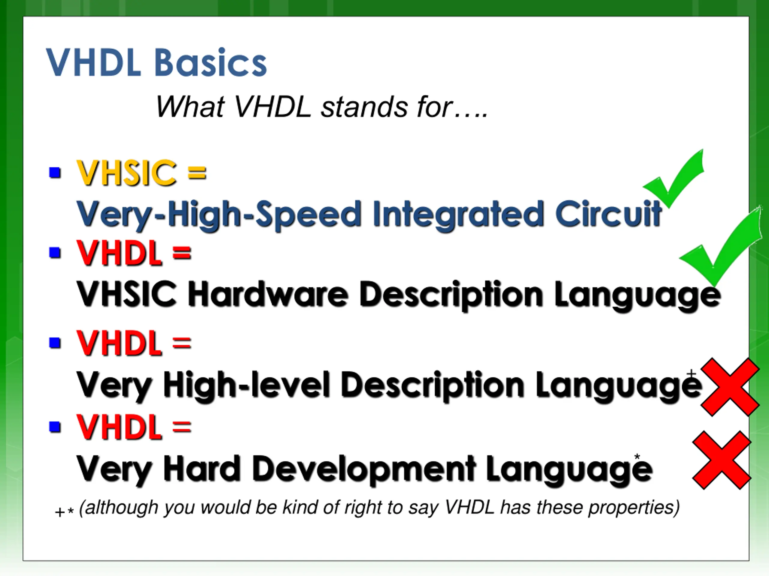 VHDL Basics What VHDL stands for . VHSIC = Very-High-Speed Integrated Circuit VHDL = VHSIC Hardware Description Language VHDL = Very High-level Description Language VHDL = Very Hard Development Language (although you would be kind of right to say VHDL has these properties) * + + *