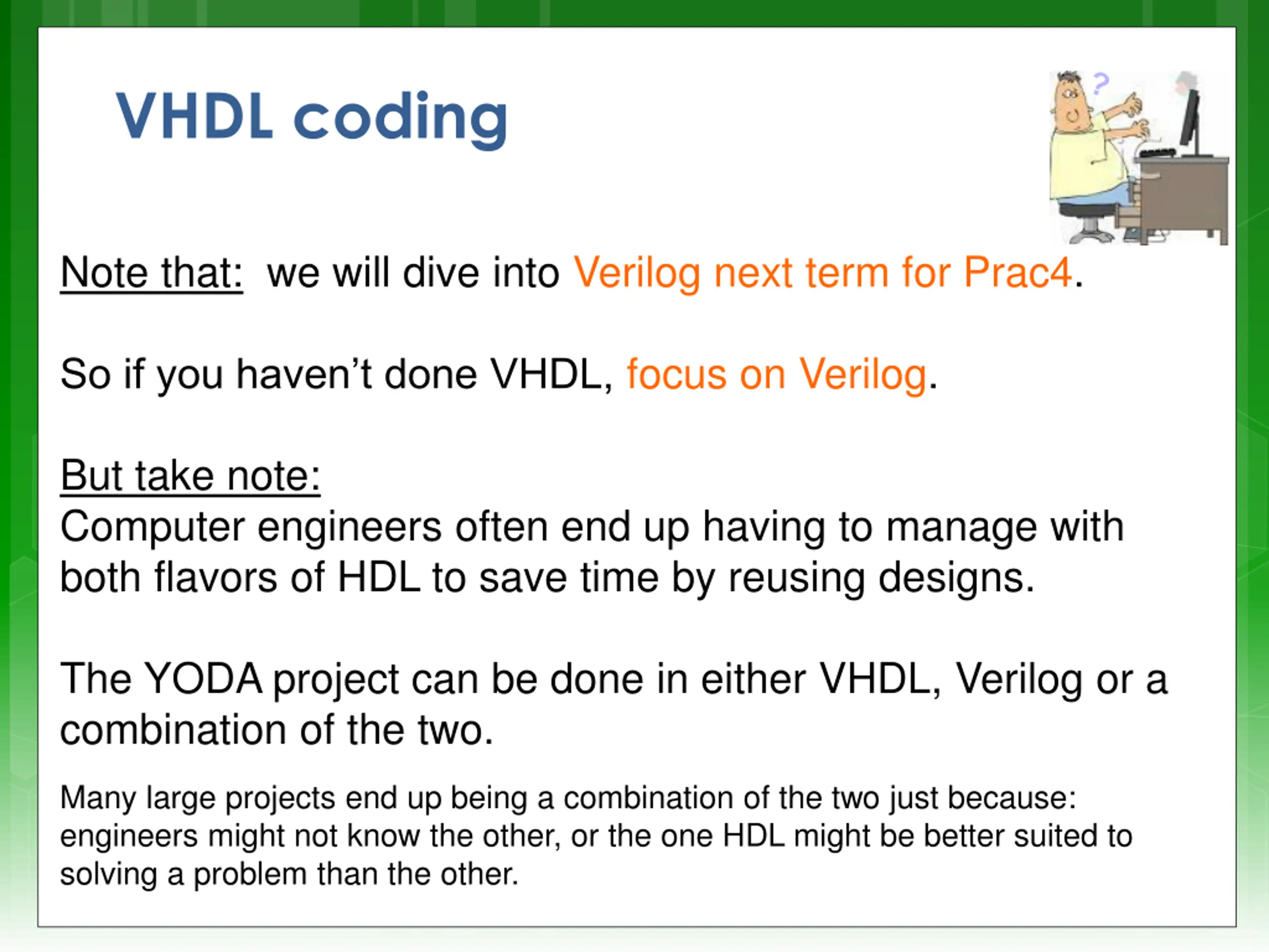 VHDL coding Note that: we will dive into Verilog next term for Prac4. So if you haven t done VHDL, focus on Verilog. But take note: Computer engineers often end up having to manage with both flavors of HDL to save time by reusing designs. The YODA project can be done in either VHDL, Verilog or a combination of the two. Many large projects end up being a combination of the two just because: engineers might not know the other, or the one HDL might be better suited to solving a problem than the other.