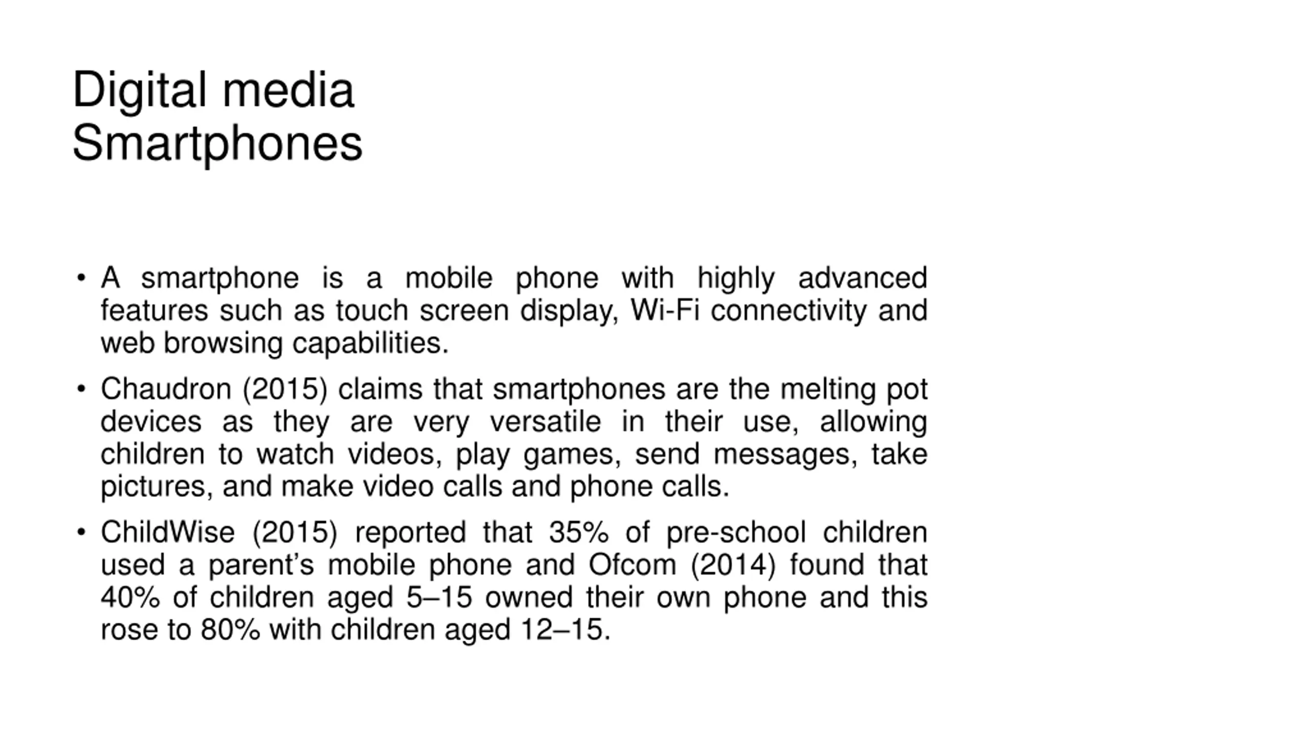 Digital media Smartphones A smartphone is a mobile phone with highly advanced features such as touch screen display, Wi-Fi connectivity and web browsing capabilities. Chaudron (2015) claims that smartphones are the melting pot devices as they are very versatile in their use, allowing children to watch videos, play games, send messages, take pictures, and make video calls and phone calls. ChildWise (2015) reported that 35% of pre-school children used a parent s mobile phone and Ofcom (2014) found that 40% of children aged 5 15 owned their own phone and this rose to 80% with children aged 12 15.