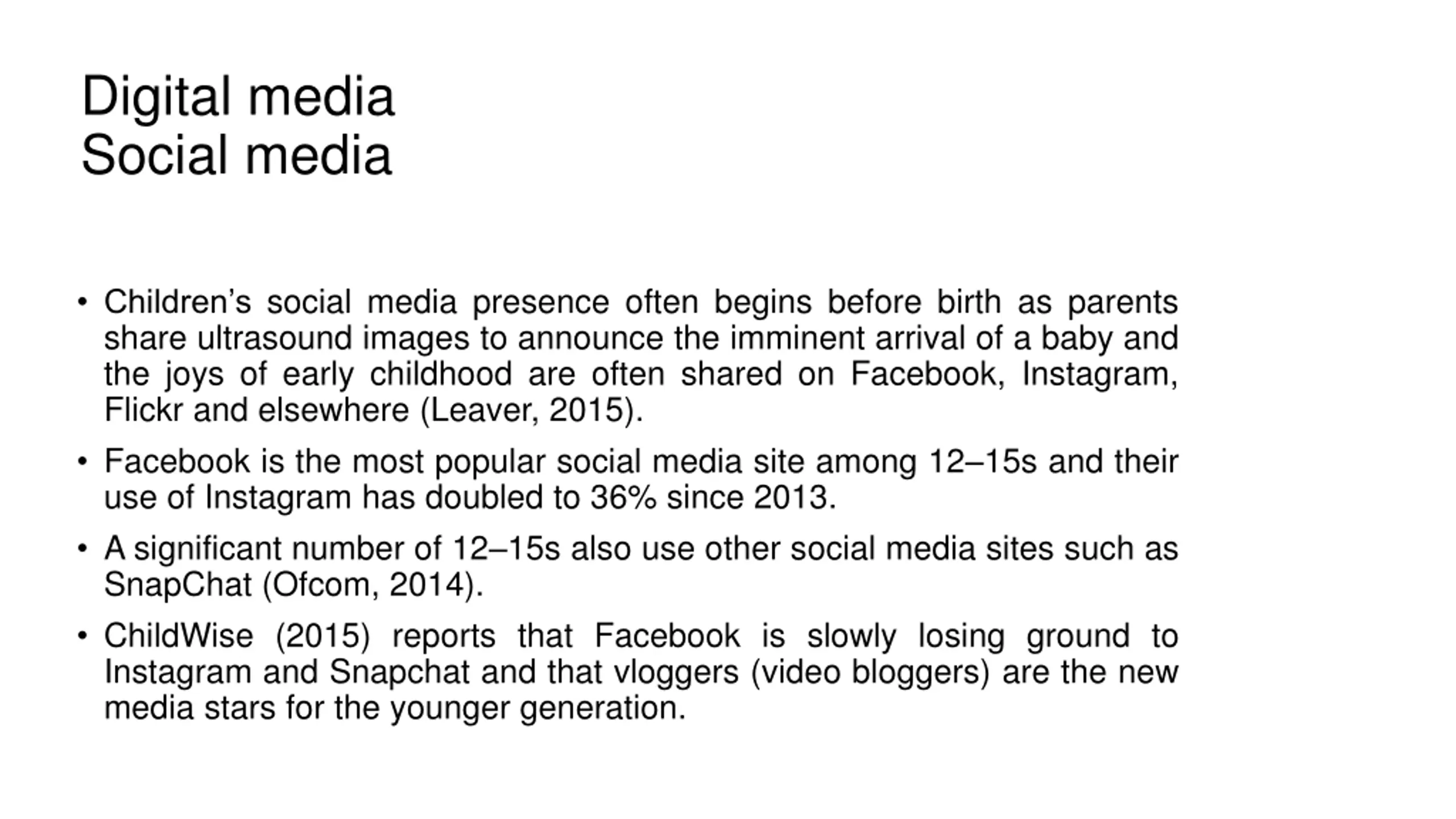 Digital media Social media Children s social media presence often begins before birth as parents share ultrasound images to announce the imminent arrival of a baby and the joys of early childhood are often shared on Facebook, Instagram, Flickr and elsewhere (Leaver, 2015). Facebook is the most popular social media site among 12 15s and their use of Instagram has doubled to 36% since 2013. A significant number of 12 15s also use other social media sites such as SnapChat (Ofcom, 2014). ChildWise (2015) reports that Facebook is slowly losing ground to Instagram and Snapchat and that vloggers (video bloggers) are the new media stars for the younger generation.