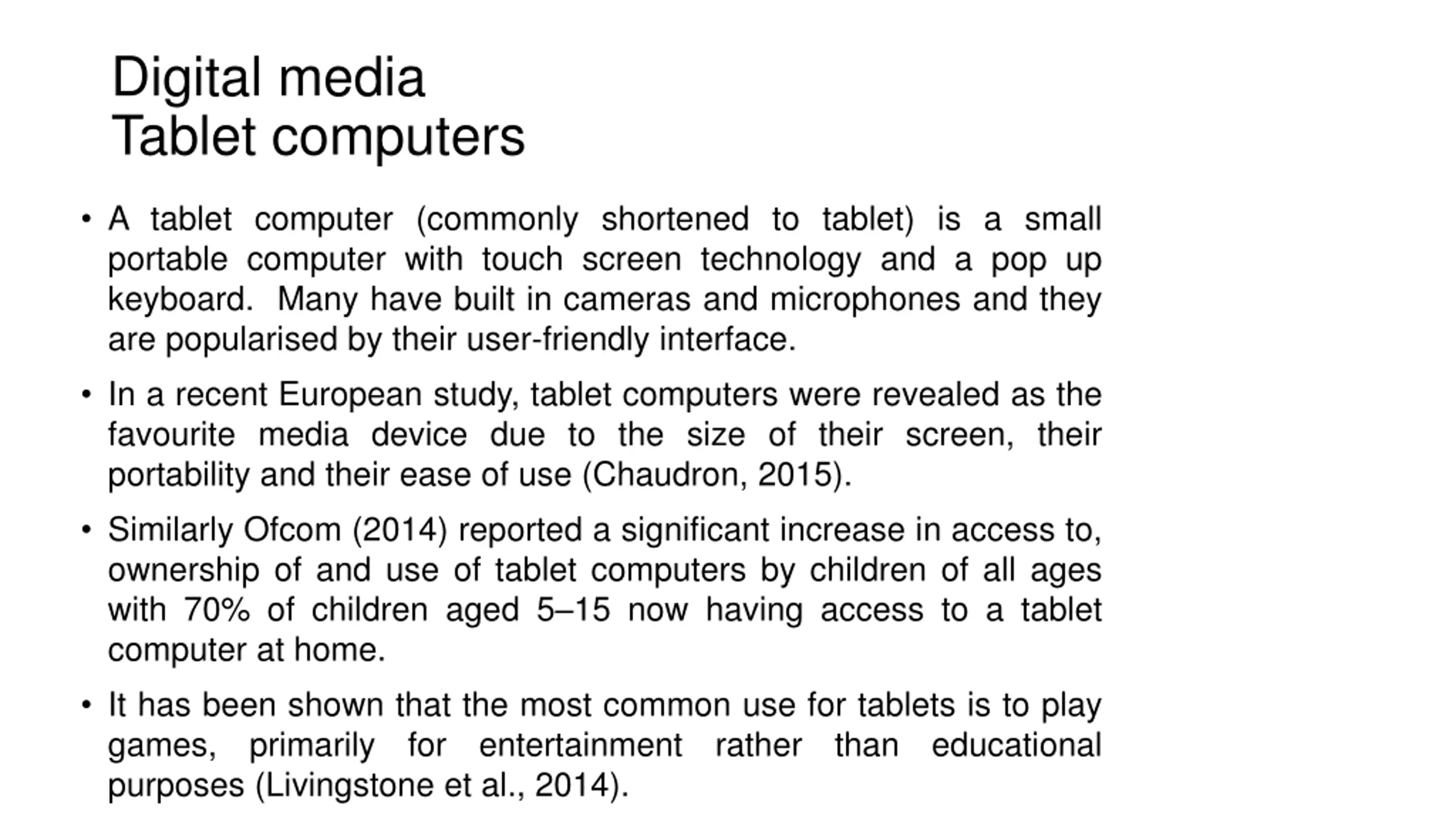 Digital media Tablet computers A tablet computer (commonly shortened to tablet) is a small portable computer with touch screen technology and a pop up keyboard. Many have built in cameras and microphones and they are popularised by their user-friendly interface. In a recent European study, tablet computers were revealed as the favourite media device due to the size of their screen, their portability and their ease of use (Chaudron, 2015). Similarly Ofcom (2014) reported a significant increase in access to, ownership of and use of tablet computers by children of all ages with 70% of children aged 5 15 now having access to a tablet computer at home. It has been shown that the most common use for tablets is to play games, primarily for entertainment purposes (Livingstone et al., 2014). rather than educational