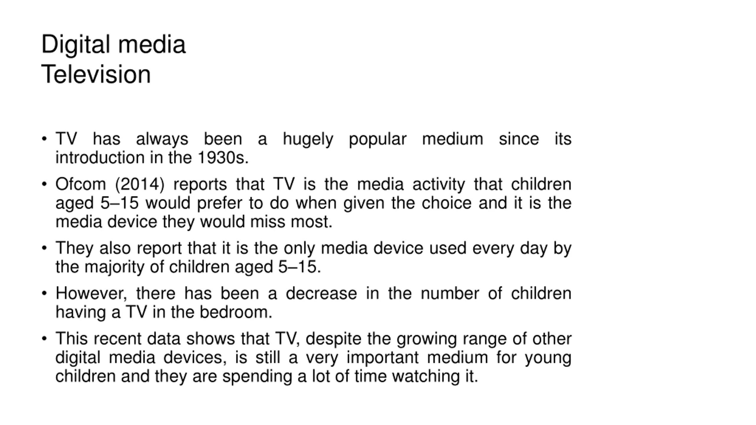 Digital media Television TV has always been a hugely popular medium since its introduction in the 1930s. Ofcom (2014) reports that TV is the media activity that children aged 5 15 would prefer to do when given the choice and it is the media device they would miss most. They also report that it is the only media device used every day by the majority of children aged 5 15. However, there has been a decrease in the number of children having a TV in the bedroom. This recent data shows that TV, despite the growing range of other digital media devices, is still a very important medium for young children and they are spending a lot of time watching it.