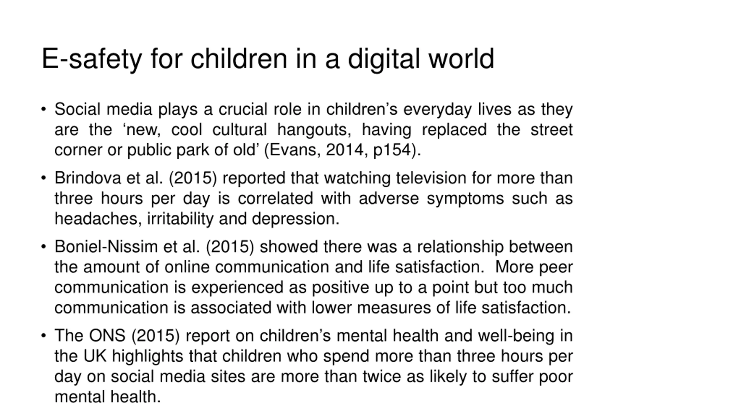 E-safety for children in a digital world Social media plays a crucial role in children s everyday lives as they are the new, cool cultural hangouts, having replaced the street corner or public park of old (Evans, 2014, p154). Brindova et al. (2015) reported that watching television for more than three hours per day is correlated with adverse symptoms such as headaches, irritability and depression. Boniel-Nissim et al. (2015) showed there was a relationship between the amount of online communication and life satisfaction. More peer communication is experienced as positive up to a point but too much communication is associated with lower measures of life satisfaction. The ONS (2015) report on children s mental health and well-being in the UK highlights that children who spend more than three hours per day on social media sites are more than twice as likely to suffer poor mental health.