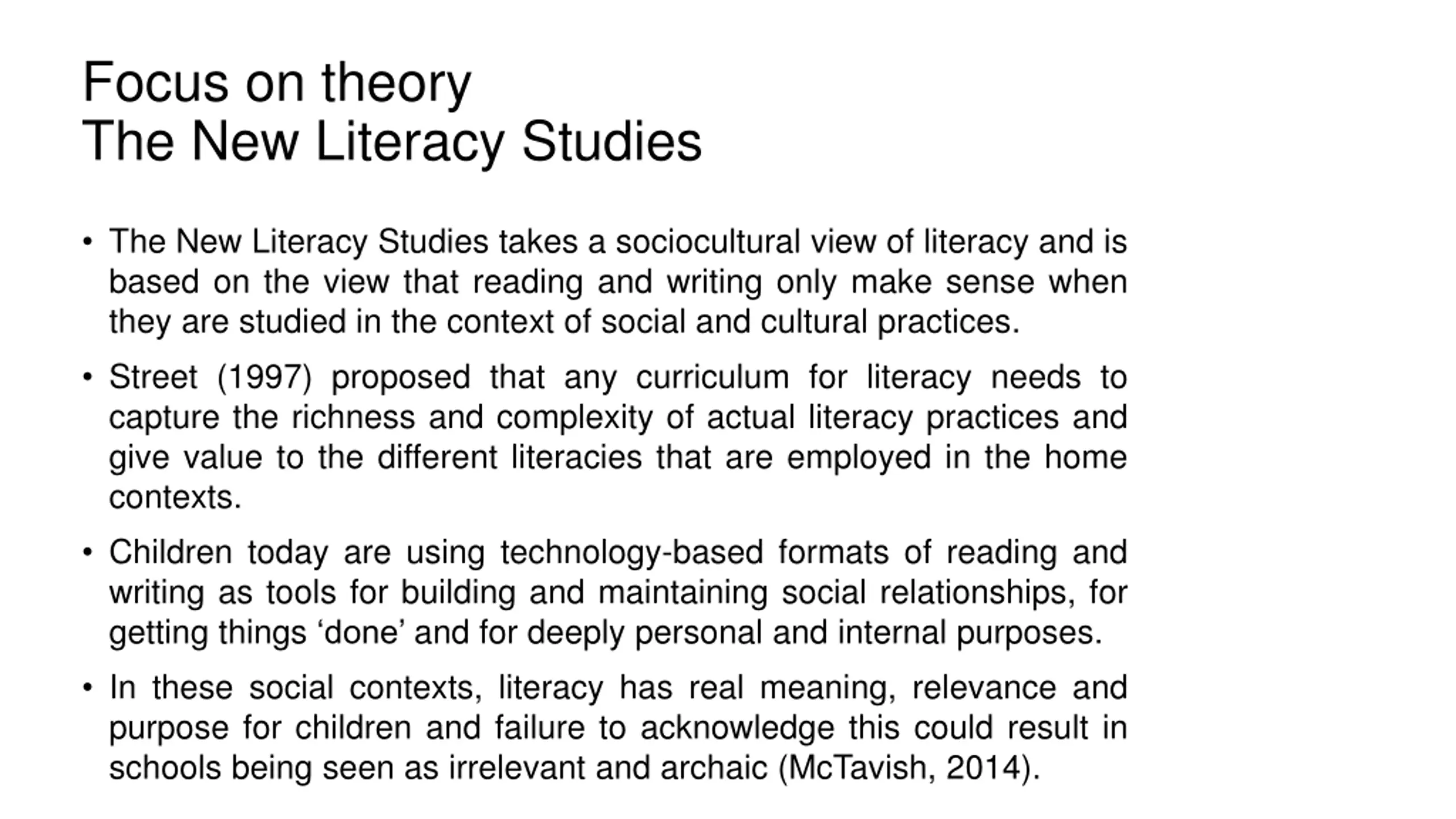 Focus on theory The New Literacy Studies The New Literacy Studies takes a sociocultural view of literacy and is based on the view that reading and writing only make sense when they are studied in the context of social and cultural practices. Street (1997) proposed that any curriculum for literacy needs to capture the richness and complexity of actual literacy practices and give value to the different literacies that are employed in the home contexts. Children today are using technology-based formats of reading and writing as tools for building and maintaining social relationships, for getting things done and for deeply personal and internal purposes. In these social contexts, literacy has real meaning, relevance and purpose for children and failure to acknowledge this could result in schools being seen as irrelevant and archaic (McTavish, 2014).