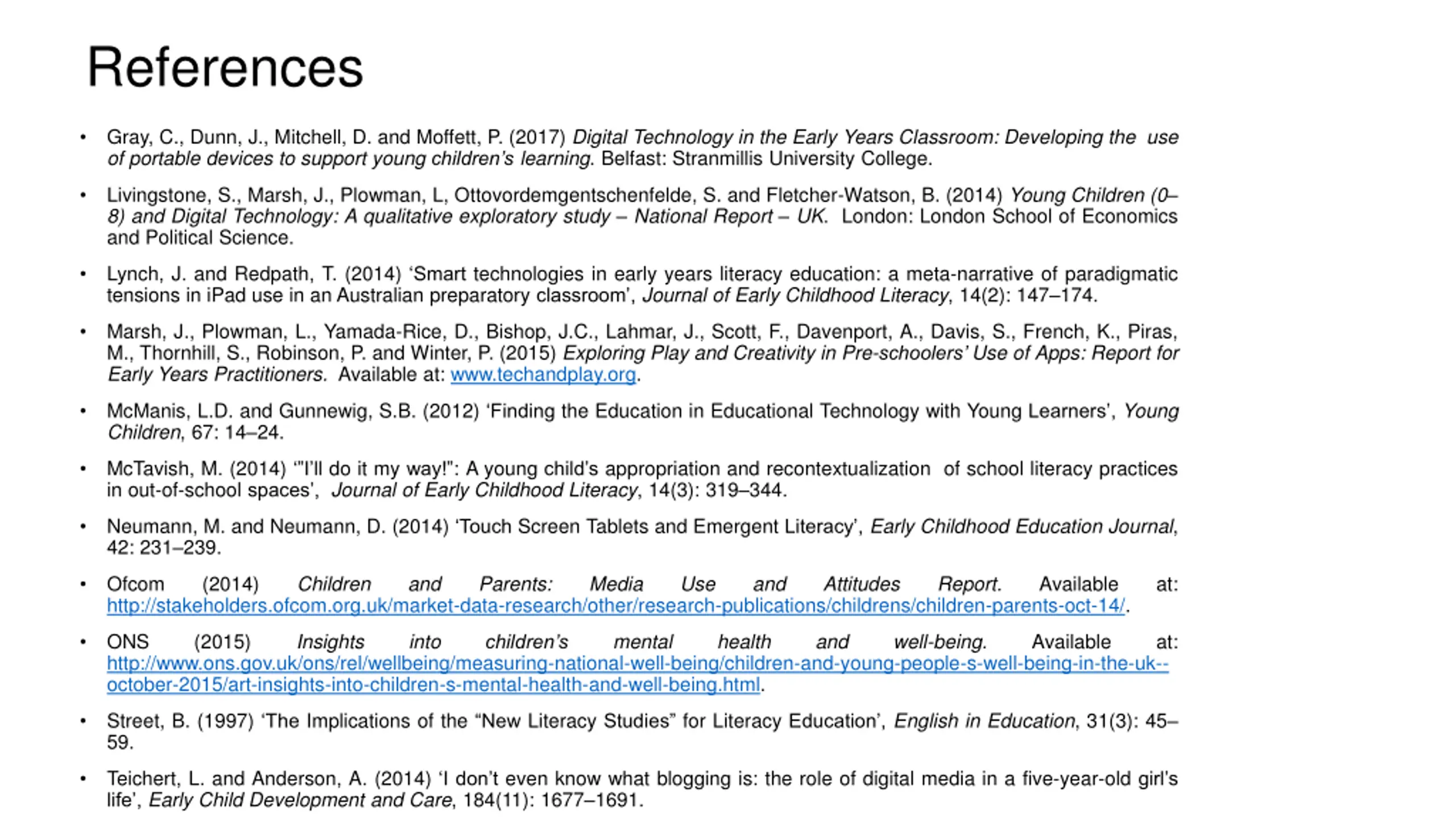 References Gray, C., Dunn, J., Mitchell, D. and Moffett, P. (2017) Digital Technology in the Early Years Classroom: Developing the use of portable devices to support young children s learning. Belfast: Stranmillis University College. Livingstone, S., Marsh, J., Plowman, L, Ottovordemgentschenfelde, S. and Fletcher-Watson, B. (2014) Young Children (0 8) and Digital Technology: A qualitative exploratory study National Report UK. London: London School of Economics and Political Science. Lynch, J. and Redpath, T. (2014) Smart technologies in early years literacy education: a meta-narrative of paradigmatic tensions in iPad use in an Australian preparatory classroom , Journal of Early Childhood Literacy, 14(2): 147 174. Marsh, J., Plowman, L., Yamada-Rice, D., Bishop, J.C., Lahmar, J., Scott, F., Davenport, A., Davis, S., French, K., Piras, M., Thornhill, S., Robinson, P. and Winter, P. (2015) Exploring Play and Creativity in Pre-schoolers Use of Apps: Report for Early Years Practitioners. Available at: www.techandplay.org. McManis, L.D. and Gunnewig, S.B. (2012) Finding the Education in Educational Technology with Young Learners , Young Children, 67: 14 24. McTavish, M. (2014) I ll do it my way! : A young child s appropriation and recontextualization of school literacy practices in out-of-school spaces , Journal of Early Childhood Literacy, 14(3): 319 344. Neumann, M. and Neumann, D. (2014) Touch Screen Tablets and Emergent Literacy , Early Childhood Education Journal, 42: 231 239. Ofcom http://stakeholders.ofcom.org.uk/market-data-research/other/research-publications/childrens/children-parents-oct-14/. (2014) Children and Parents: Media Use and Attitudes Report. Available at: ONS http://www.ons.gov.uk/ons/rel/wellbeing/measuring-national-well-being/children-and-young-people-s-well-being-in-the-uk-- october-2015/art-insights-into-children-s-mental-health-and-well-being.html. (2015) Insights into mental health and well-being. Available at: children s Street, B. (1997) The Implications of the New Literacy Studies for Literacy Education , English in Education, 31(3): 45 59. Teichert, L. and Anderson, A. (2014) I don t even know what blogging is: the role of digital media in a five-year-old girl s life , Early Child Development and Care, 184(11): 1677 1691.