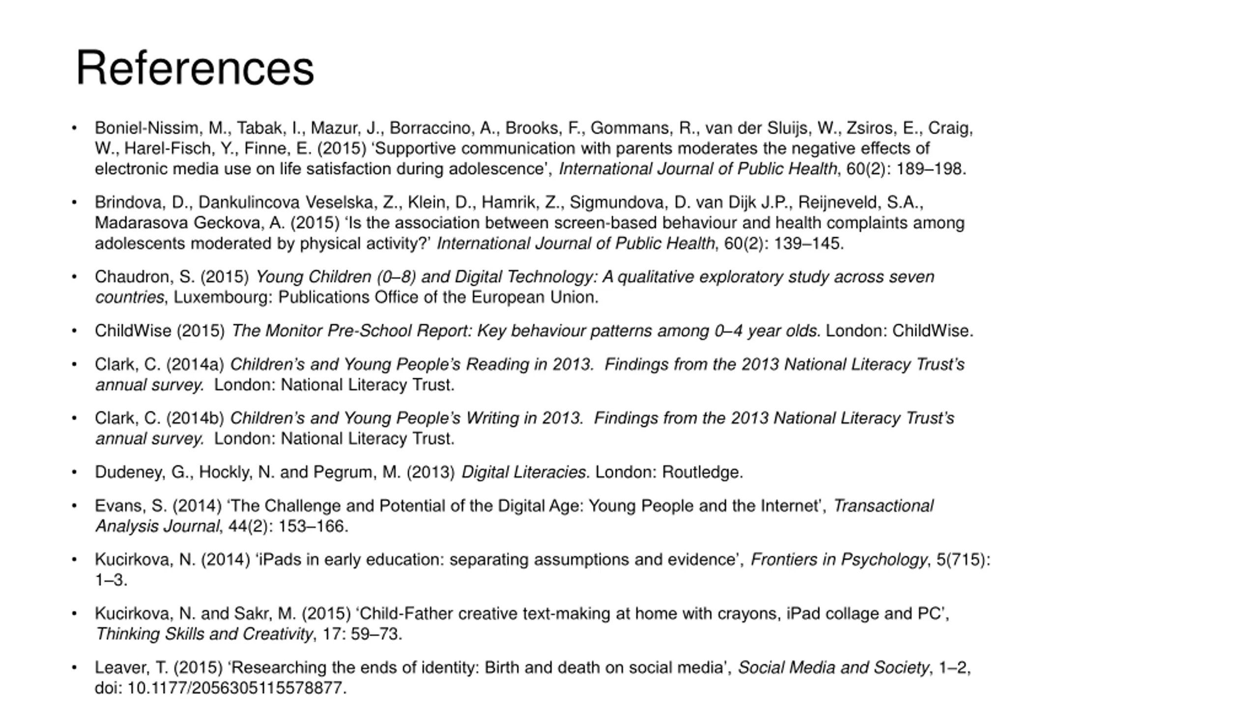 References Boniel-Nissim, M., Tabak, I., Mazur, J., Borraccino, A., Brooks, F., Gommans, R., van der Sluijs, W., Zsiros, E., Craig, W., Harel-Fisch, Y., Finne, E. (2015) Supportive communication with parents moderates the negative effects of electronic media use on life satisfaction during adolescence , International Journal of Public Health, 60(2): 189 198. Brindova, D., Dankulincova Veselska, Z., Klein, D., Hamrik, Z., Sigmundova, D. van Dijk J.P., Reijneveld, S.A., Madarasova Geckova, A. (2015) Is the association between screen-based behaviour and health complaints among adolescents moderated by physical activity? International Journal of Public Health, 60(2): 139 145. Chaudron, S. (2015) Young Children (0 8) and Digital Technology: A qualitative exploratory study across seven countries, Luxembourg: Publications Office of the European Union. ChildWise (2015) The Monitor Pre-School Report: Key behaviour patterns among 0 4 year olds. London: ChildWise. Clark, C. (2014a) Children s and Young People s Reading in 2013. Findings from the 2013 National Literacy Trust s annual survey. London: National Literacy Trust. Clark, C. (2014b) Children s and Young People s Writing in 2013. Findings from the 2013 National Literacy Trust s annual survey. London: National Literacy Trust. Dudeney, G., Hockly, N. and Pegrum, M. (2013) Digital Literacies. London: Routledge. Evans, S. (2014) The Challenge and Potential of the Digital Age: Young People and the Internet , Transactional Analysis Journal, 44(2): 153 166. Kucirkova, N. (2014) iPads in early education: separating assumptions and evidence , Frontiers in Psychology, 5(715): 1 3. Kucirkova, N. and Sakr, M. (2015) Child-Father creative text-making at home with crayons, iPad collage and PC , Thinking Skills and Creativity, 17: 59 73. Leaver, T. (2015) Researching the ends of identity: Birth and death on social media , Social Media and Society, 1 2, doi: 10.1177/2056305115578877.