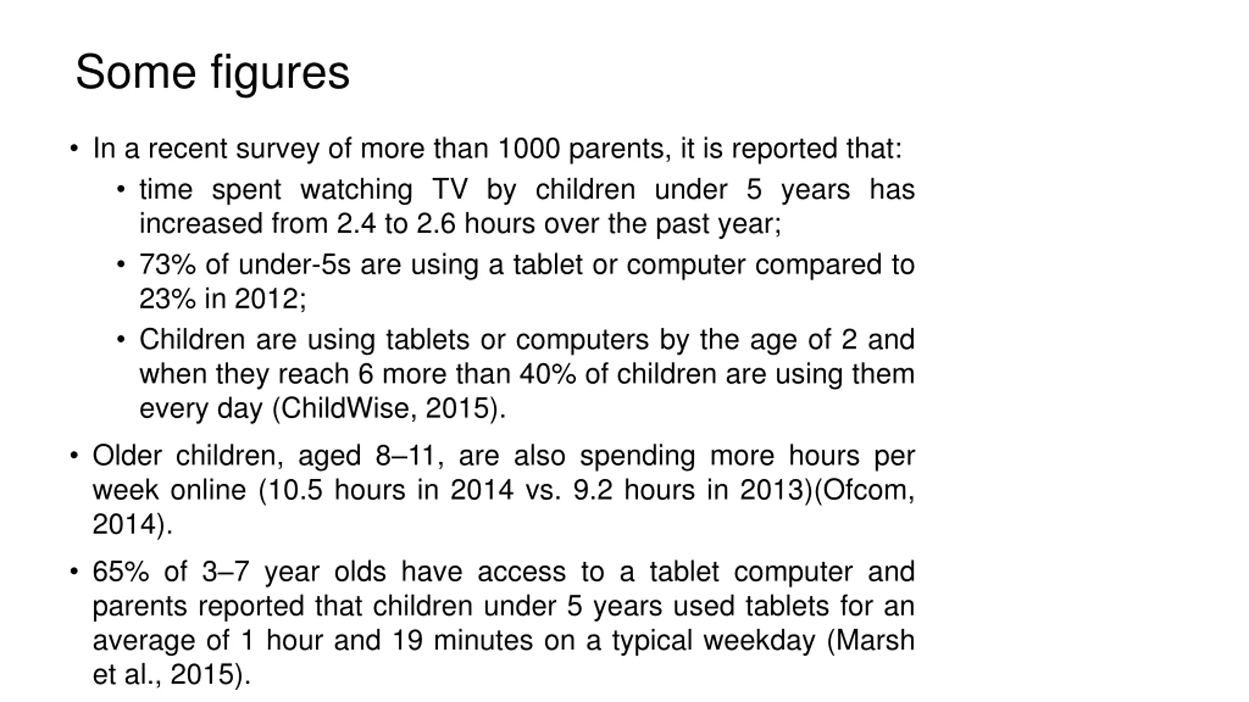 Some figures In a recent survey of more than 1000 parents, it is reported that: time spent watching TV by children under 5 years has increased from 2.4 to 2.6 hours over the past year; 73% of under-5s are using a tablet or computer compared to 23% in 2012; Children are using tablets or computers by the age of 2 and when they reach 6 more than 40% of children are using them every day (ChildWise, 2015). Older children, aged 8 11, are also spending more hours per week online (10.5 hours in 2014 vs. 9.2 hours in 2013)(Ofcom, 2014). 65% of 3 7 year olds have access to a tablet computer and parents reported that children under 5 years used tablets for an average of 1 hour and 19 minutes on a typical weekday (Marsh et al., 2015).