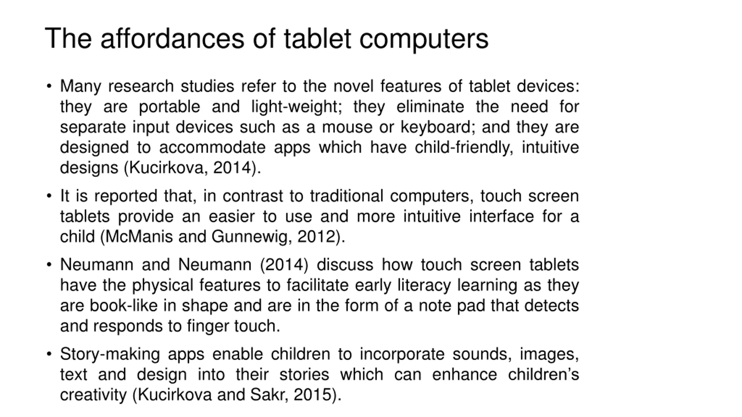 The affordances of tablet computers Many research studies refer to the novel features of tablet devices: they are portable and light-weight; they eliminate the need for separate input devices such as a mouse or keyboard; and they are designed to accommodate apps which have child-friendly, intuitive designs (Kucirkova, 2014). It is reported that, in contrast to traditional computers, touch screen tablets provide an easier to use and more intuitive interface for a child (McManis and Gunnewig, 2012). Neumann and Neumann (2014) discuss how touch screen tablets have the physical features to facilitate early literacy learning as they are book-like in shape and are in the form of a note pad that detects and responds to finger touch. Story-making apps enable children to incorporate sounds, images, text and design into their stories which can enhance children s creativity (Kucirkova and Sakr, 2015).