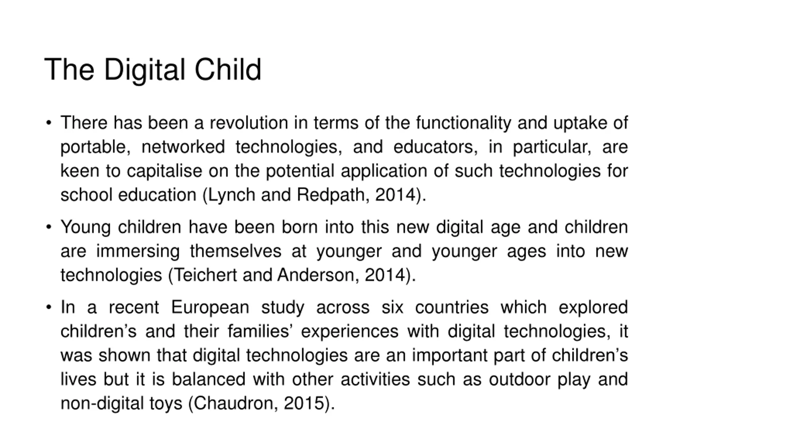 The Digital Child There has been a revolution in terms of the functionality and uptake of portable, networked technologies, and educators, in particular, are keen to capitalise on the potential application of such technologies for school education (Lynch and Redpath, 2014). Young children have been born into this new digital age and children are immersing themselves at younger and younger ages into new technologies (Teichert and Anderson, 2014). In a recent European study across six countries which explored children s and their families experiences with digital technologies, it was shown that digital technologies are an important part of children s lives but it is balanced with other activities such as outdoor play and non-digital toys (Chaudron, 2015).