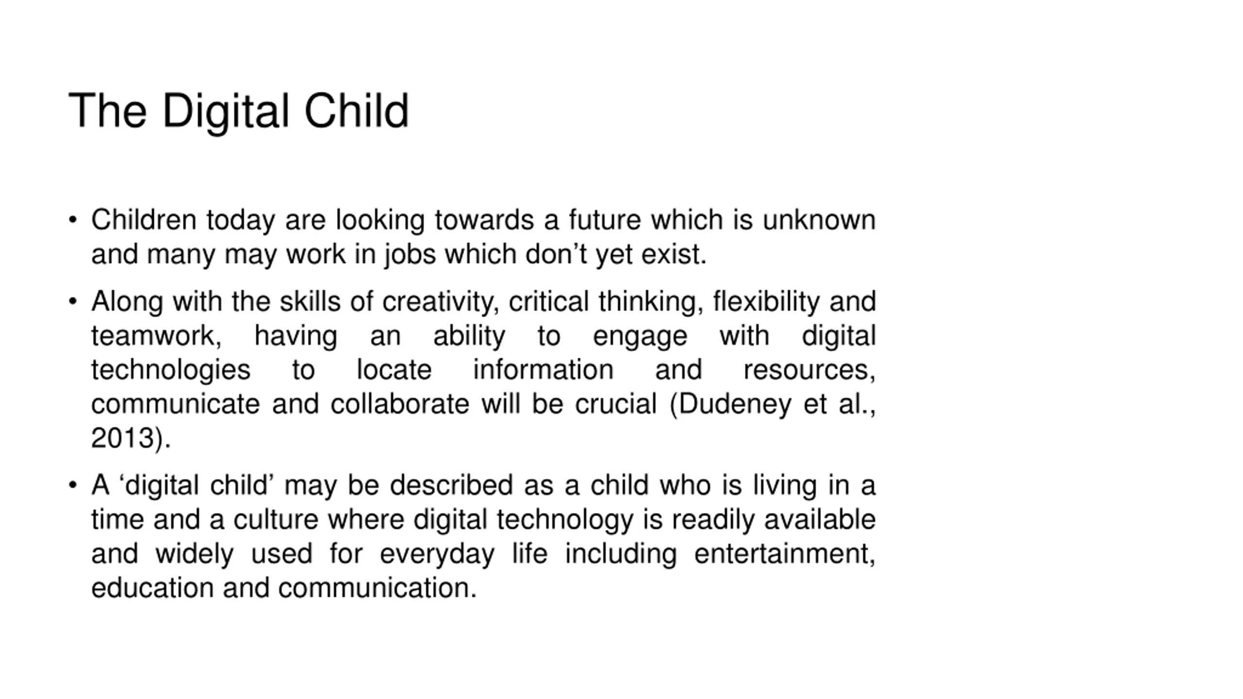 The Digital Child Children today are looking towards a future which is unknown and many may work in jobs which don t yet exist. Along with the skills of creativity, critical thinking, flexibility and teamwork, having an ability technologies to locate communicate and collaborate will be crucial (Dudeney et al., 2013). A digital child may be described as a child who is living in a time and a culture where digital technology is readily available and widely used for everyday life including entertainment, education and communication. to engage with resources, digital information and