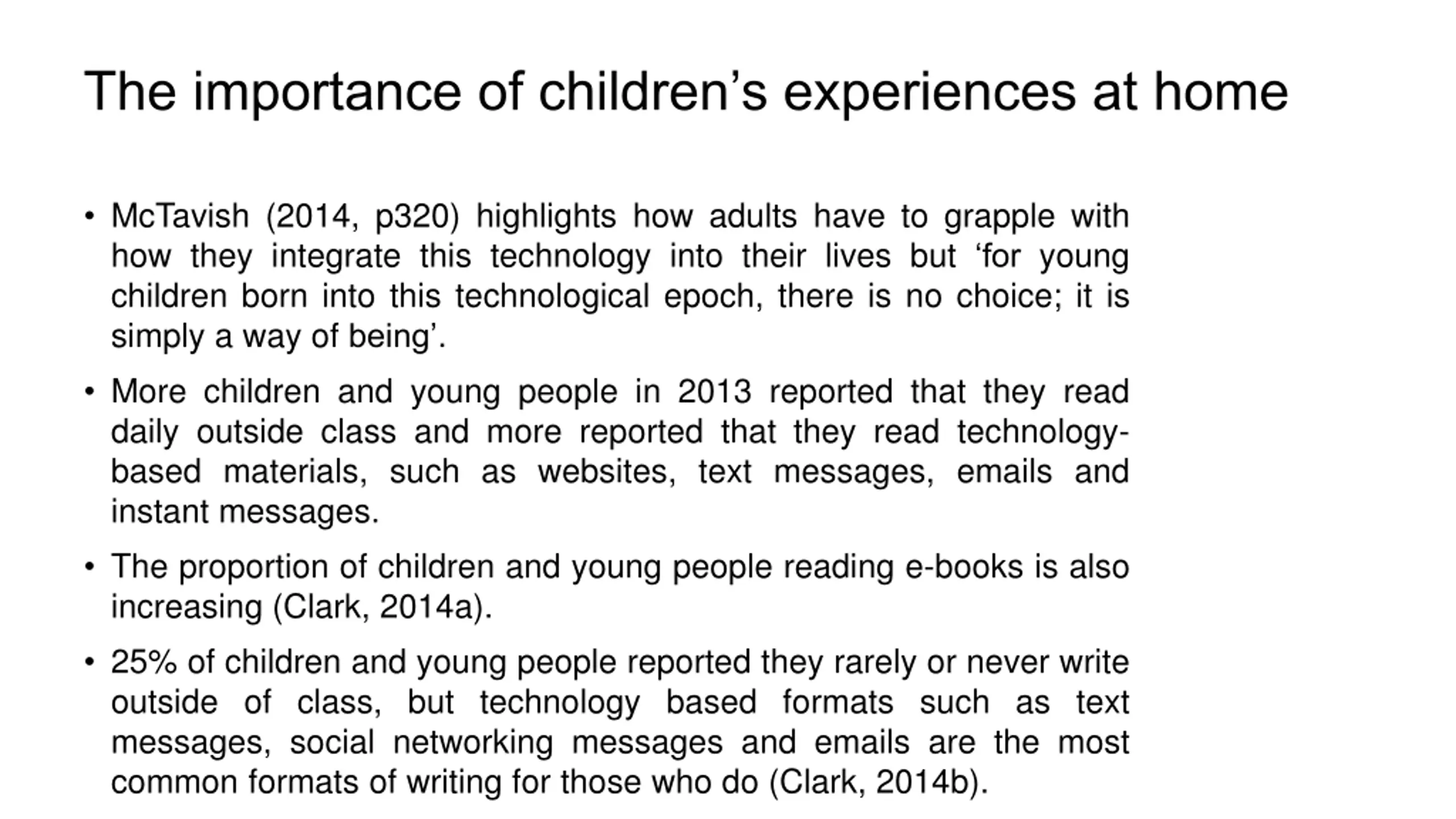 The importance of childrens experiences at home McTavish (2014, p320) highlights how adults have to grapple with how they integrate this technology into their lives but for young children born into this technological epoch, there is no choice; it is simply a way of being . More children and young people in 2013 reported that they read daily outside class and more reported that they read technology- based materials, such as websites, text messages, emails and instant messages. The proportion of children and young people reading e-books is also increasing (Clark, 2014a). 25% of children and young people reported they rarely or never write outside of class, but technology based formats such as text messages, social networking messages and emails are the most common formats of writing for those who do (Clark, 2014b).