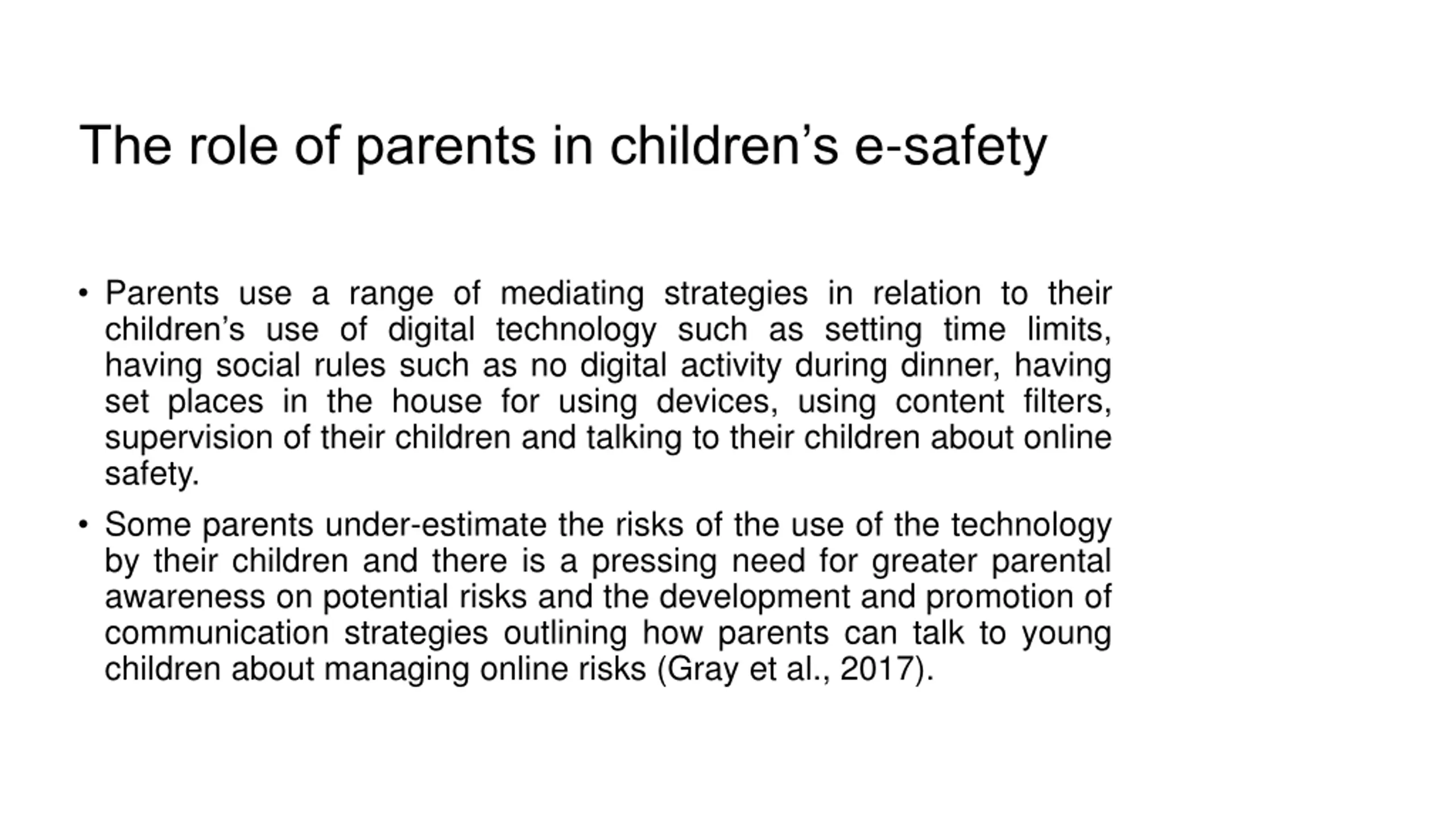 The role of parents in childrens e-safety Parents use a range of mediating strategies in relation to their children s use of digital technology such as setting time limits, having social rules such as no digital activity during dinner, having set places in the house for using devices, using content filters, supervision of their children and talking to their children about online safety. Some parents under-estimate the risks of the use of the technology by their children and there is a pressing need for greater parental awareness on potential risks and the development and promotion of communication strategies outlining how parents can talk to young children about managing online risks (Gray et al., 2017).