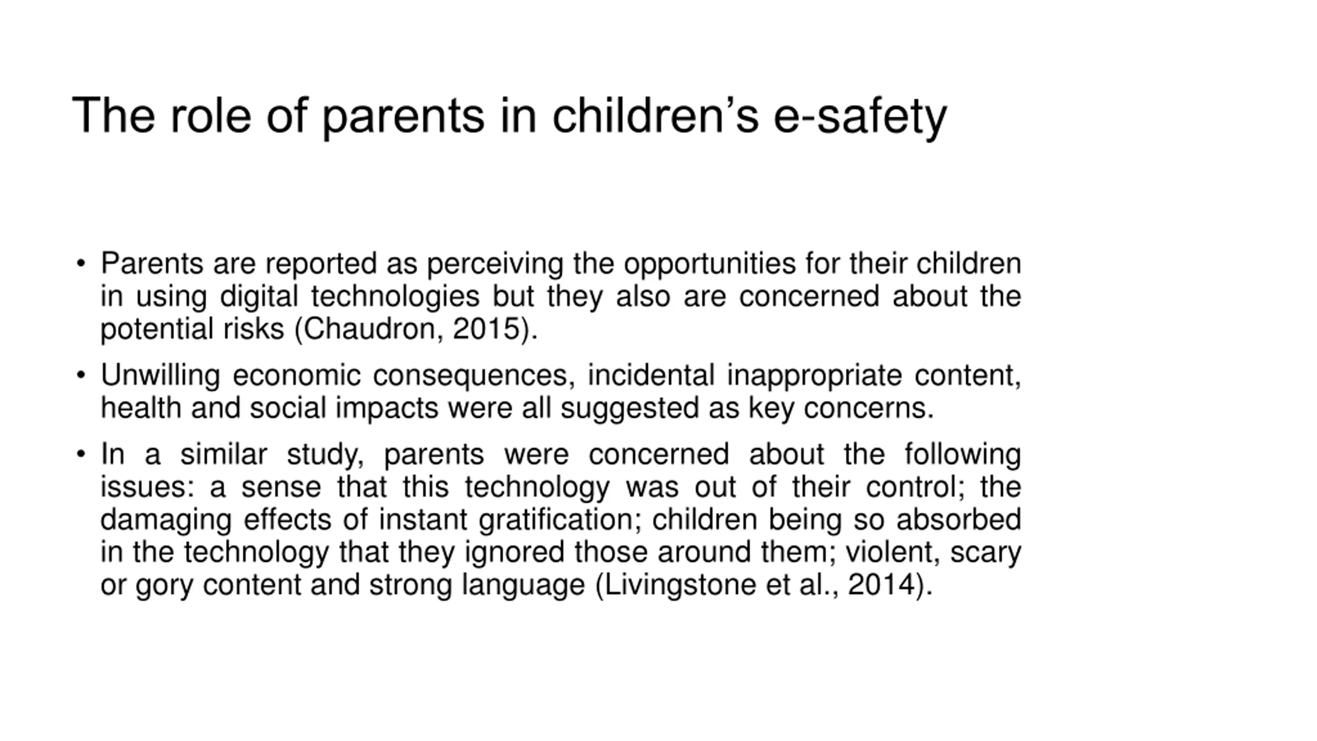 The role of parents in childrens e-safety Parents are reported as perceiving the opportunities for their children in using digital technologies but they also are concerned about the potential risks (Chaudron, 2015). Unwilling economic consequences, incidental inappropriate content, health and social impacts were all suggested as key concerns. In a similar study, parents were concerned about the following issues: a sense that this technology was out of their control; the damaging effects of instant gratification; children being so absorbed in the technology that they ignored those around them; violent, scary or gory content and strong language (Livingstone et al., 2014).