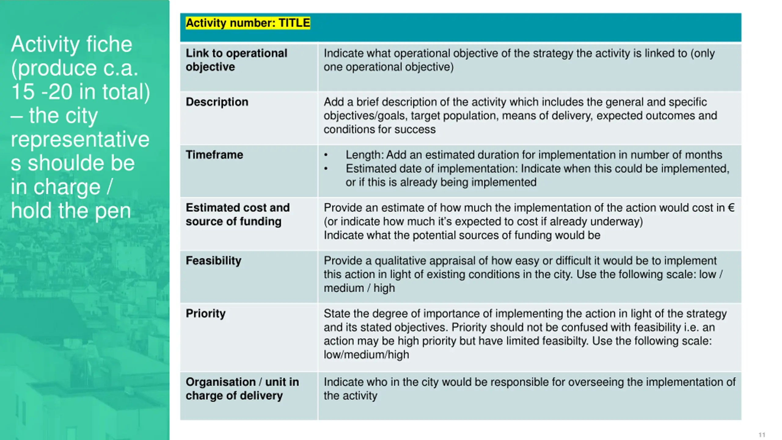 Step 3: Roadmap development What is an activity? Any strategy is implemented through specific activities An activity can be described as a tangible and concrete action, which has a beginning and an end, accompanied by a specific objective and resources for its implementation Examples of activities may include: Building or development of specific types of infrastructure Financing capacity building activities such as training sessions Launching calls for projects (e.g. research projects) Organising networking and collaboration schemes Developing data portals Providing innovation within firms through grants or loans Investment in venture capital funds / other financial instruments Your city can plan to develop new activities or build on existing ones The results of activities (i.e. outputs) are meant to contribute to reaching your operational objectives. Common activity outputs may include: Individuals with strengthened digital skills Research projects conducted Firms financed / volume of financing Infrastructure developed 10