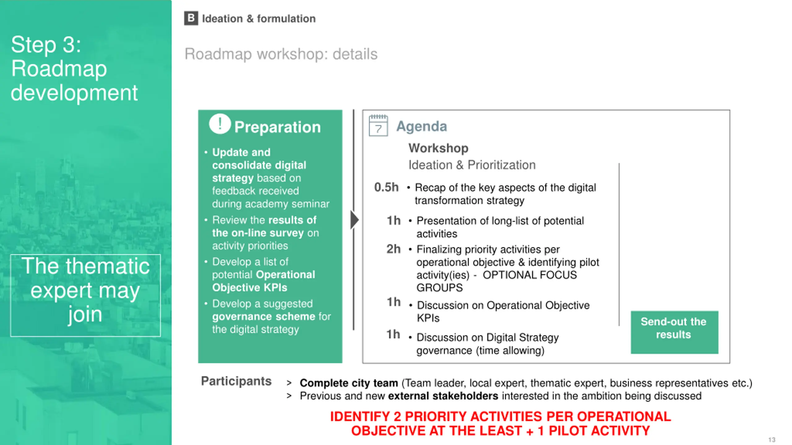 B Ideation & formulation Step 3: Roadmap development Roadmap workshop: details Preparation Agenda Workshop Ideation & Prioritization Update and consolidate digital strategy based on feedback received during academy seminar Review the results of the on-line survey on activity priorities Develop a list of potential Operational Objective KPIs Develop a suggested governance scheme for the digital strategy 0.5h Recap of the key aspects of the digital transformation strategy 1h Presentation of long-list of potential activities 2h Finalizing priority activities per operational objective & identifying pilot activity(ies) - OPTIONAL FOCUS GROUPS Discussion on Operational Objective KPIs 1h Discussion on Digital Strategy governance (time allowing) The thematic expert may join 1h Send-out the results Participants > Complete city team (Team leader, local expert, thematic expert, business representatives etc.) > Previous and new external stakeholders interested in the ambition being discussed IDENTIFY 2 PRIORITY ACTIVITIES PER OPERATIONAL OBJECTIVE AT THE LEAST + 1 PILOT ACTIVITY 13
