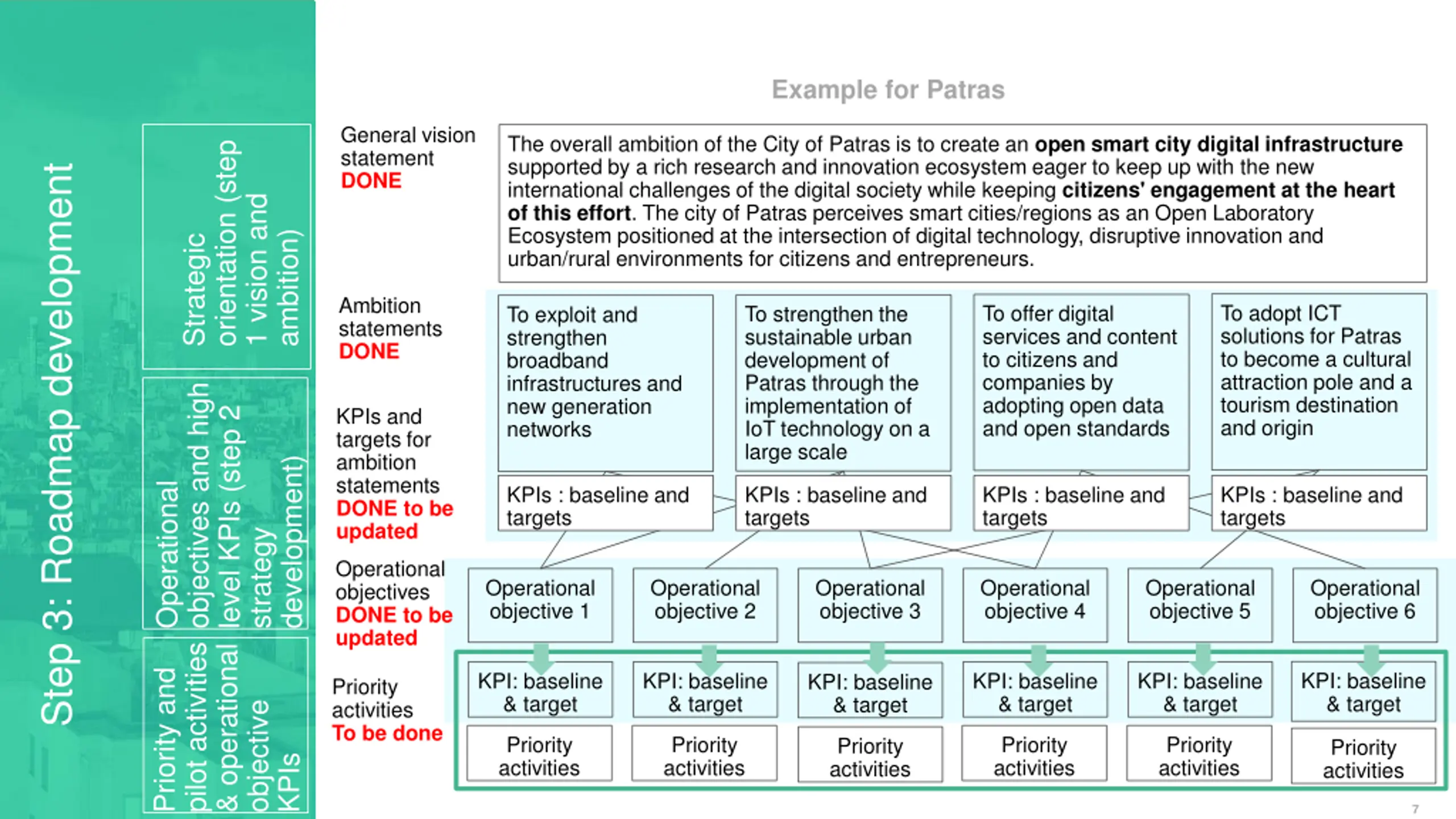 Step 3: Roadmap development Key concepts and definitions Roadmap: The component of the digital transformation strategy that describes the practical implementation of the strategy, including priority activities and governance Monitoring Indicators: Indicators to be used to monitor the progress and success of your digital transformation strategy. In the context of step 3, they refer to the indicators to measure progress towards the operational objectives. Priority activities: The specific actions through which the strategy will be implemented. An activity can be described as a tangible and concrete action, which has a beginning and an end, accompanied by a specific objective and resources for its implementation. Pilot activity: One or two activities to be selected within the framework of the DCC project, and implemented in the short term to launch the digital transformation strategy. Digitalisation strategy governance: The scheme and system through which the implementation of the digital transformation strategy will be managed and overseen. This includes a detailed description of roles and responsibilities of managing, implementing and governing partners and agents. 6