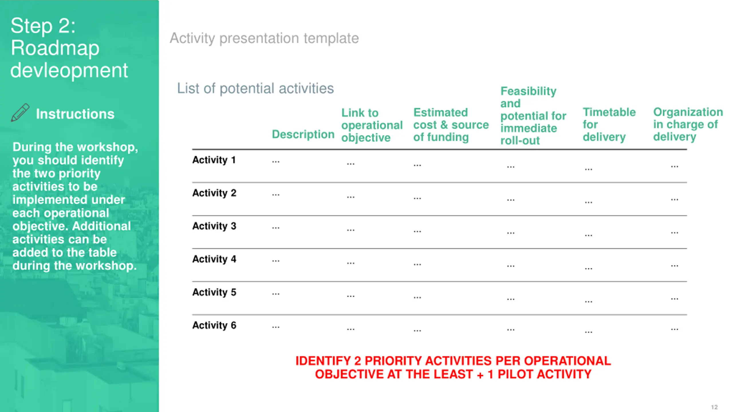 Step 2: Roadmap devleopment Activity presentation template List of potential activities Feasibility and potential for immediate roll-out Organization in charge of delivery Timetable for delivery Estimated cost & source of funding Instructions Link to operational objective Description During the workshop, you should identify the two priority activities to be implemented under each operational objective. Additional activities can be added to the table during the workshop. ... Activity 1 ... ... ... ... ... ... Activity 2 ... ... ... ... ... ... Activity 3 ... ... ... ... ... ... Activity 4 ... ... ... ... ... ... Activity 5 ... ... ... ... ... ... Activity 6 ... ... ... ... ... IDENTIFY 2 PRIORITY ACTIVITIES PER OPERATIONAL OBJECTIVE AT THE LEAST + 1 PILOT ACTIVITY 12