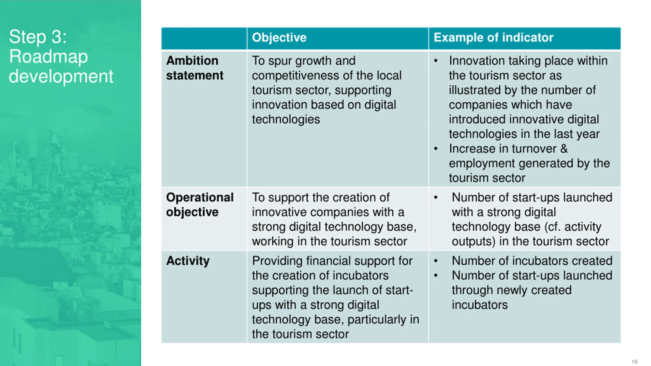 Step 3: Roadmap development Objective Example of indicator To spur growth and competitiveness of the local tourism sector, supporting innovation based on digital technologies Innovation taking place within the tourism sector as illustrated by the number of companies which have introduced innovative digital technologies in the last year Increase in turnover & employment generated by the tourism sector Number of start-ups launched with a strong digital technology base (cf. activity outputs) in the tourism sector Number of incubators created Number of start-ups launched through newly created incubators Ambition statement To support the creation of innovative companies with a strong digital technology base, working in the tourism sector Providing financial support for the creation of incubators supporting the launch of start- ups with a strong digital technology base, particularly in the tourism sector Operational objective Activity 18