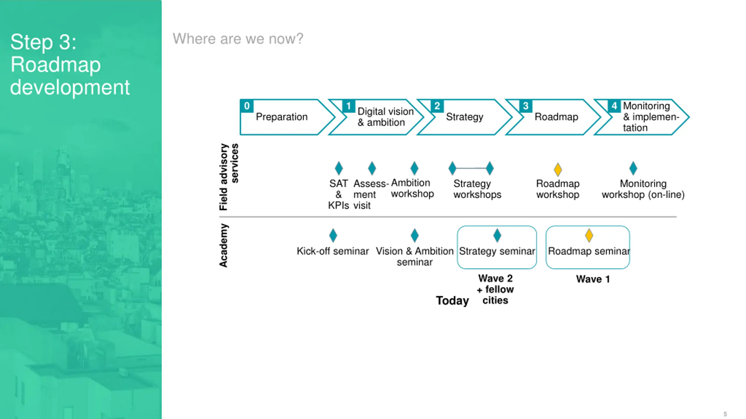 Step 3: Roadmap development Where are we now? 0 1 2 3 4 Monitoring & implemen- tation Digital vision & ambition Preparation Strategy Roadmap Field advisory services Ambition workshop SAT & KPIs Assess- ment visit Strategy workshops Roadmap workshop Monitoring workshop (on-line) Academy Kick-off seminar Vision & Ambition seminar Strategy seminar Roadmap seminar Wave 2 + fellow cities Wave 1 Today 5