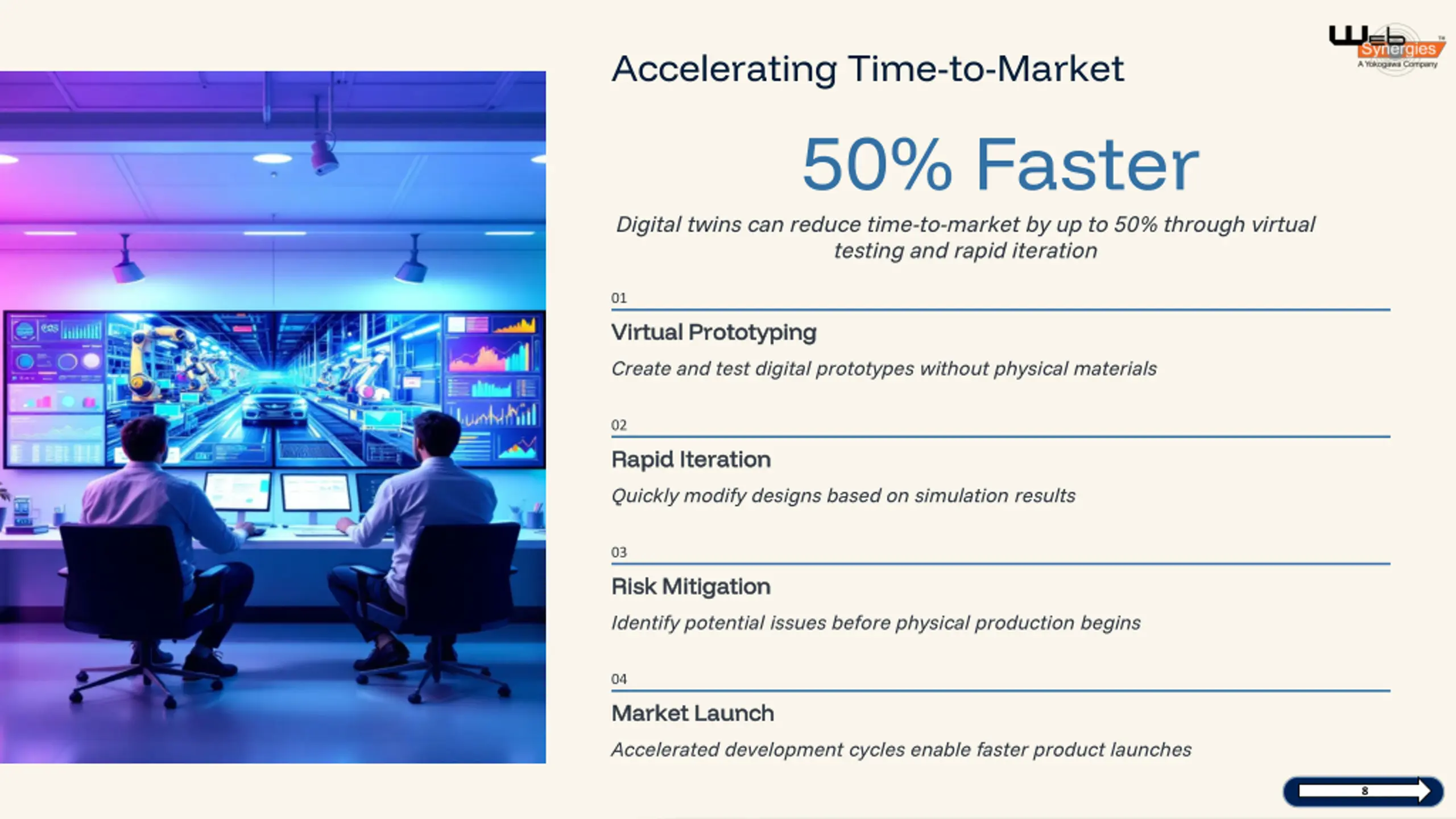 Accelerating Time-to-Market 50% Faster Digital twins can reduce time-to-market by up to 50% through virtual testing and rapid iteration 01 Virtual Prototyping Virtual Prototyping Create and test digital prototypes without physical materials 02 Rapid Iteration Rapid Iteration Quickly modify designs based on simulation results 03 Risk Mitigation Risk Mitigation Identify potential issues before physical production begins 04 Market Launch Market Launch Accelerated development cycles enable faster product launches preencoded.png 8