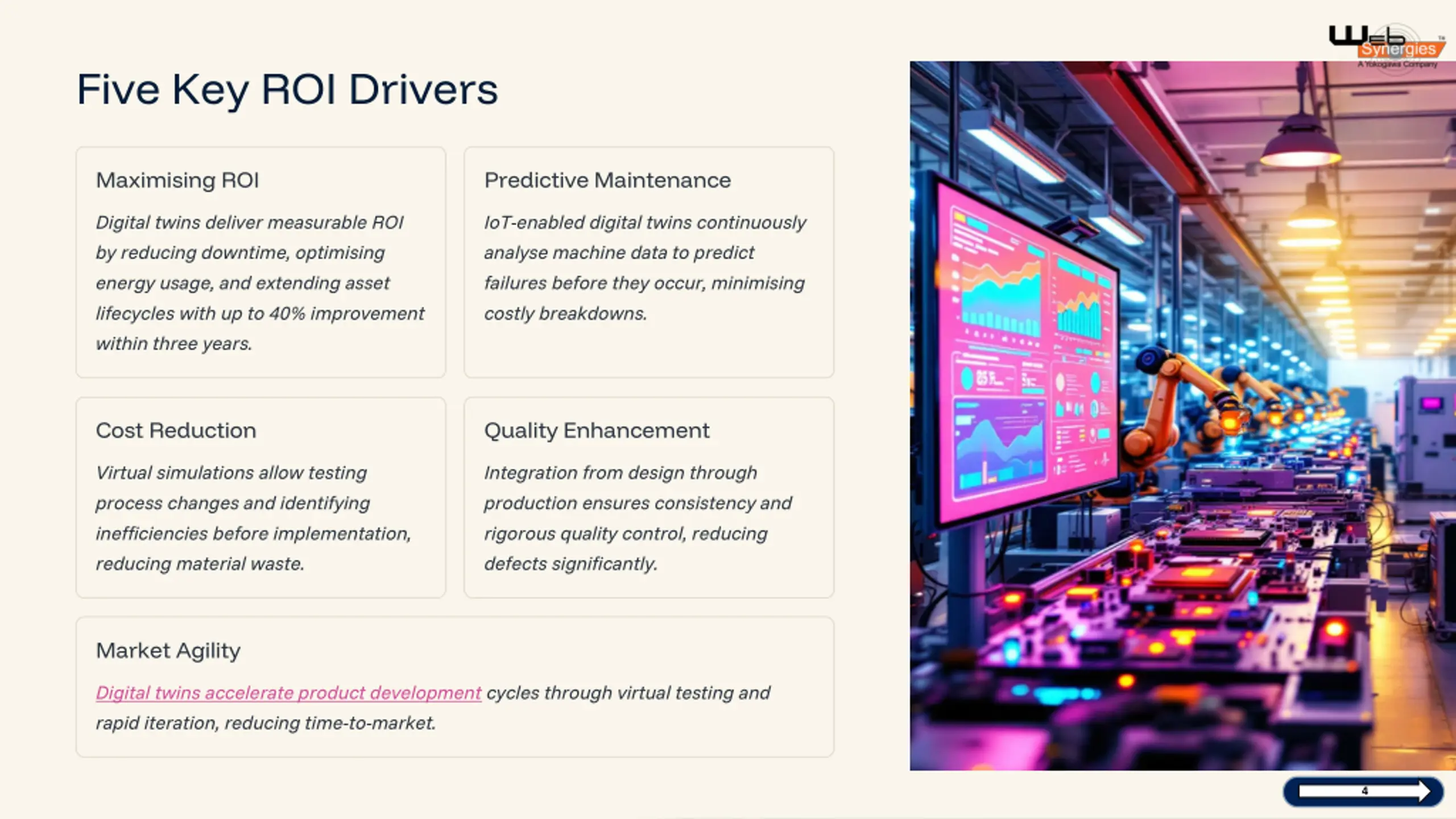 Five Key ROI Drivers Maximising ROI Predictive Maintenance Digital twins deliver measurable ROI by reducing downtime, optimising energy usage, and extending asset lifecycles with up to 40% improvement within three years. IoT-enabled digital twins continuously analyse machine data to predict failures before they occur, minimising costly breakdowns. Cost Reduction Quality Enhancement Virtual simulations allow testing process changes and identifying inefficiencies before implementation, reducing material waste. Integration from design through production ensures consistency and rigorous quality control, reducing defects significantly. Market Agility Digital twins accelerate product development cycles through virtual testing and rapid iteration, reducing time-to-market. preencoded.png 4