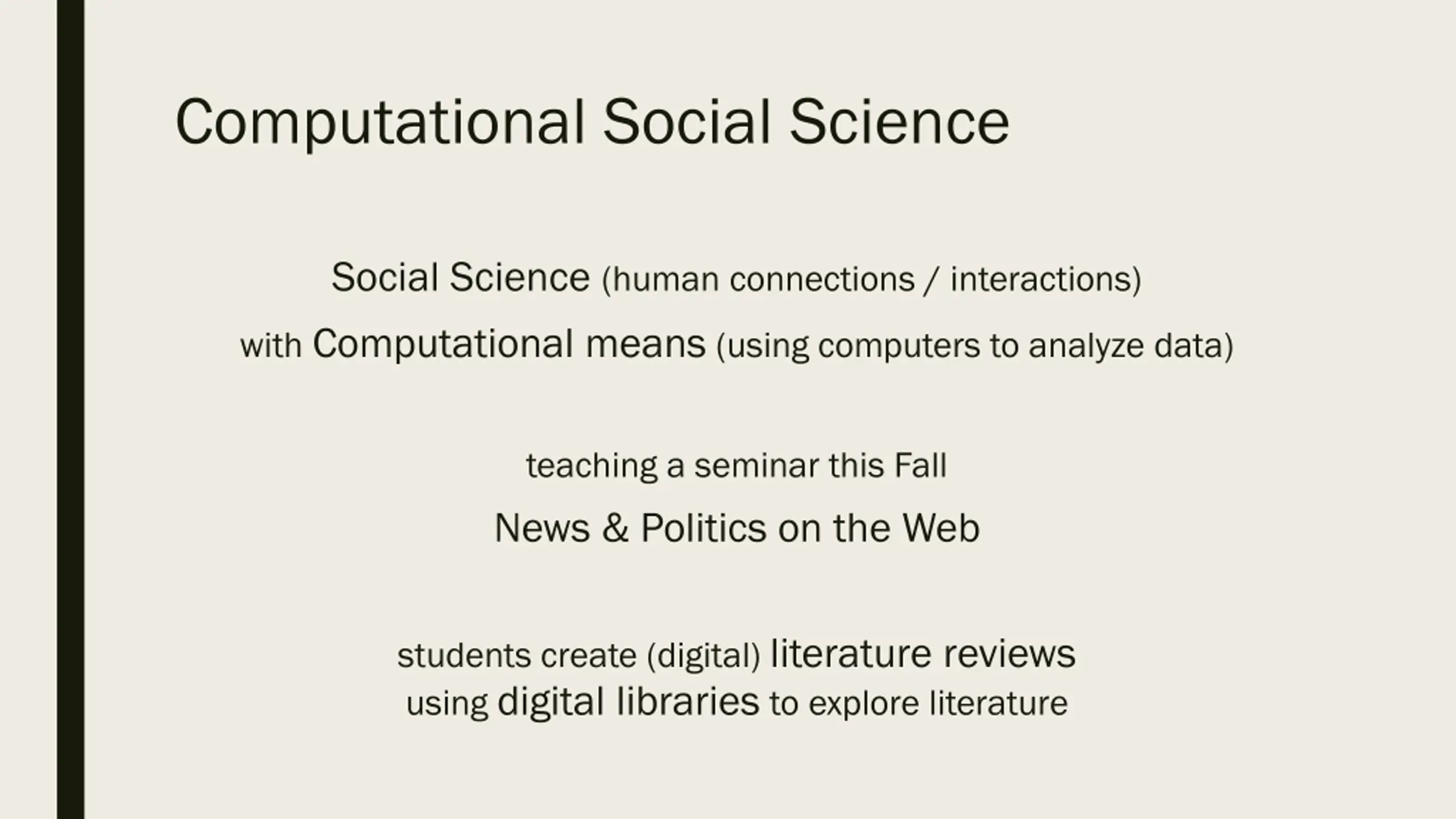 Computational Social Science Social Science (human connections / interactions) with Computational means (using computers to analyze data) teaching a seminar this Fall News & Politics on the Web students create (digital) literature reviews using digital libraries to explore literature