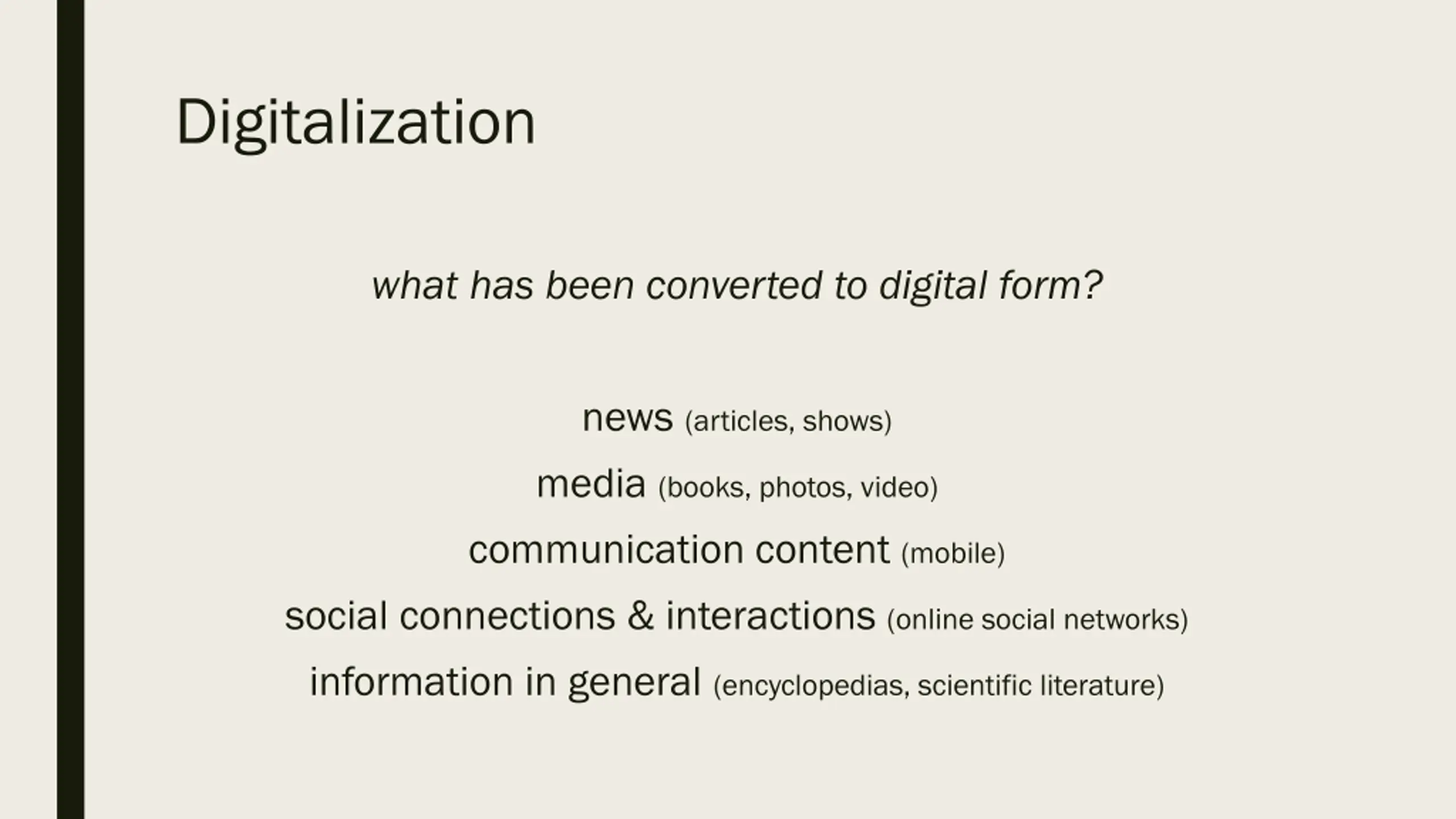 Digitalization what has been converted to digital form? news (articles, shows) media (books, photos, video) communication content (mobile) social connections & interactions (online social networks) information in general (encyclopedias, scientific literature)