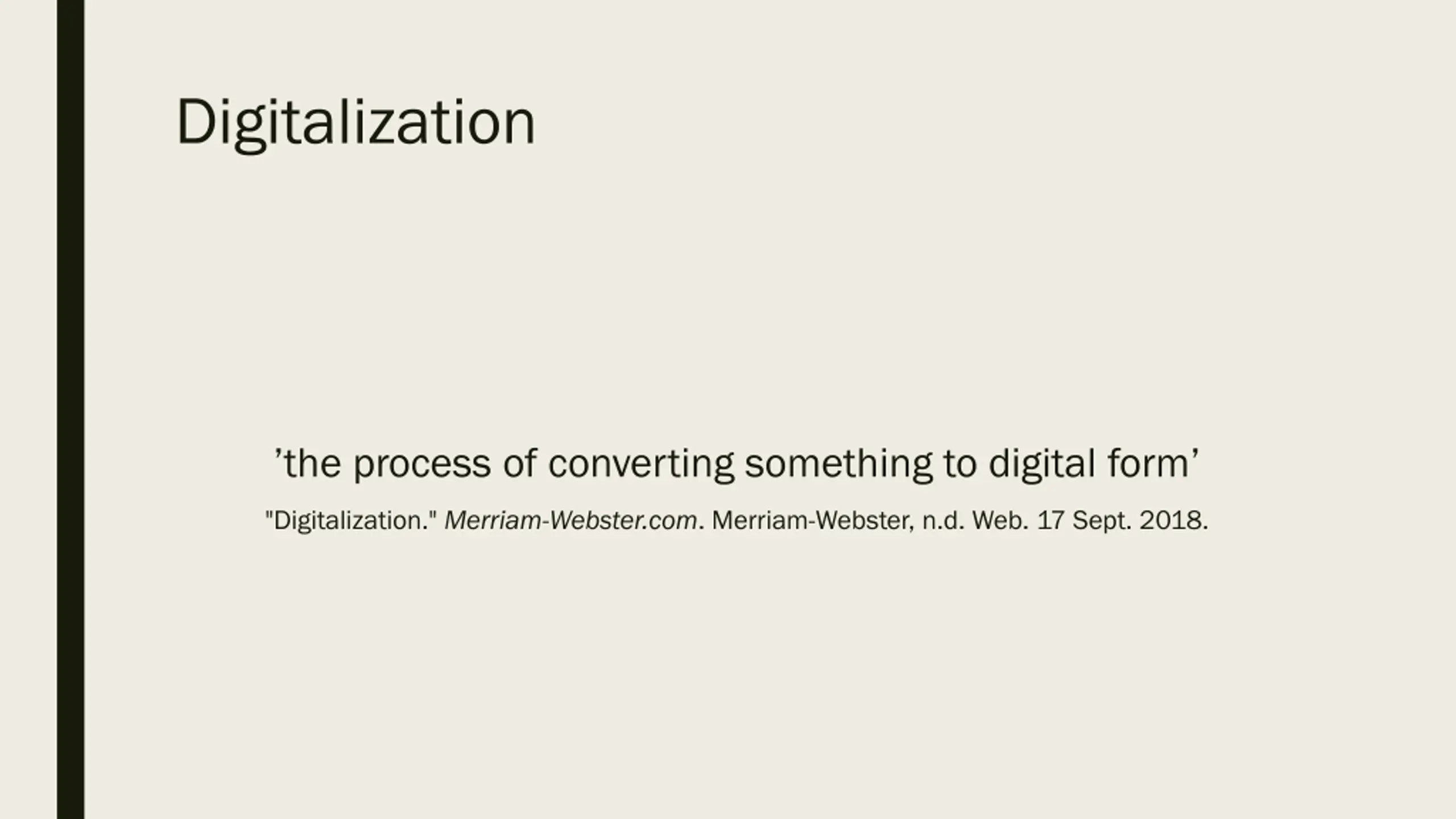 Digitalization the process of converting something to digital form "Digitalization." Merriam-Webster.com. Merriam-Webster, n.d. Web. 17 Sept. 2018.