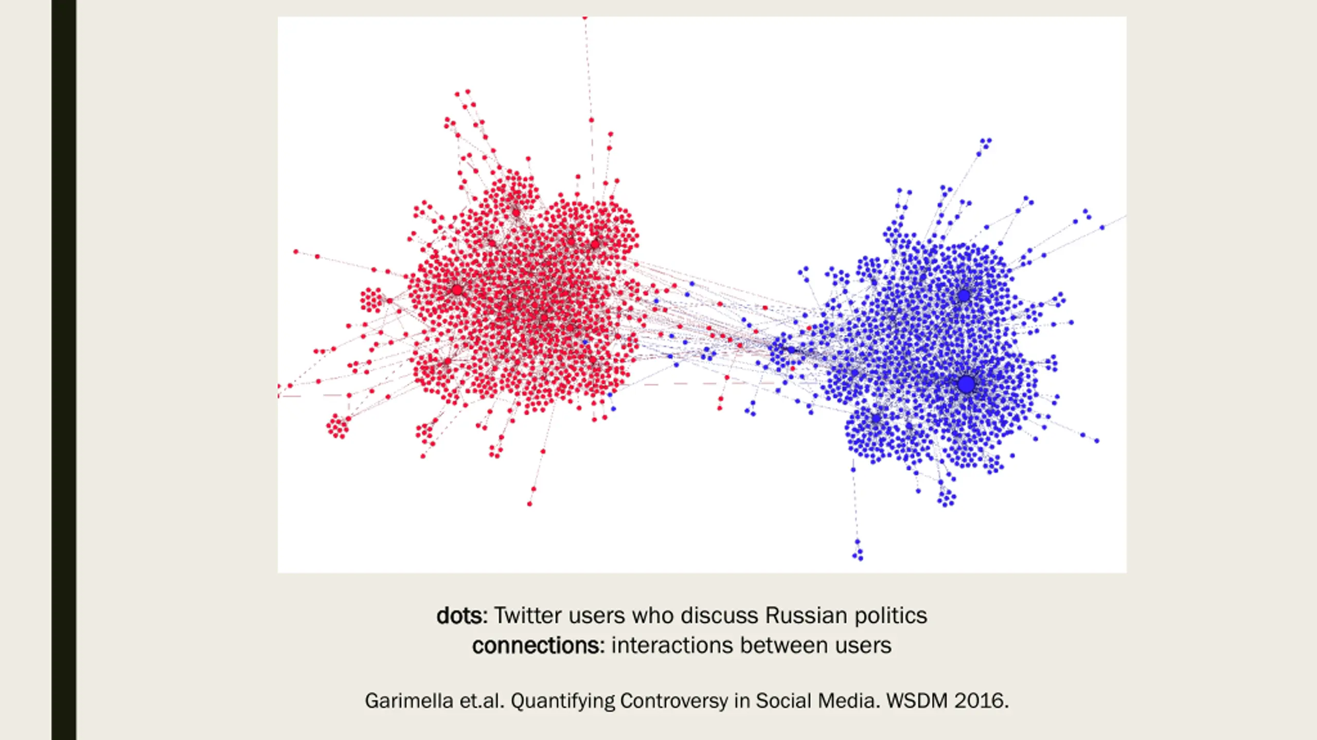 dots dots: Twitter users who discuss Russian politics connections connections: interactions between users Garimella et.al. Quantifying Controversy in Social Media. WSDM 2016.