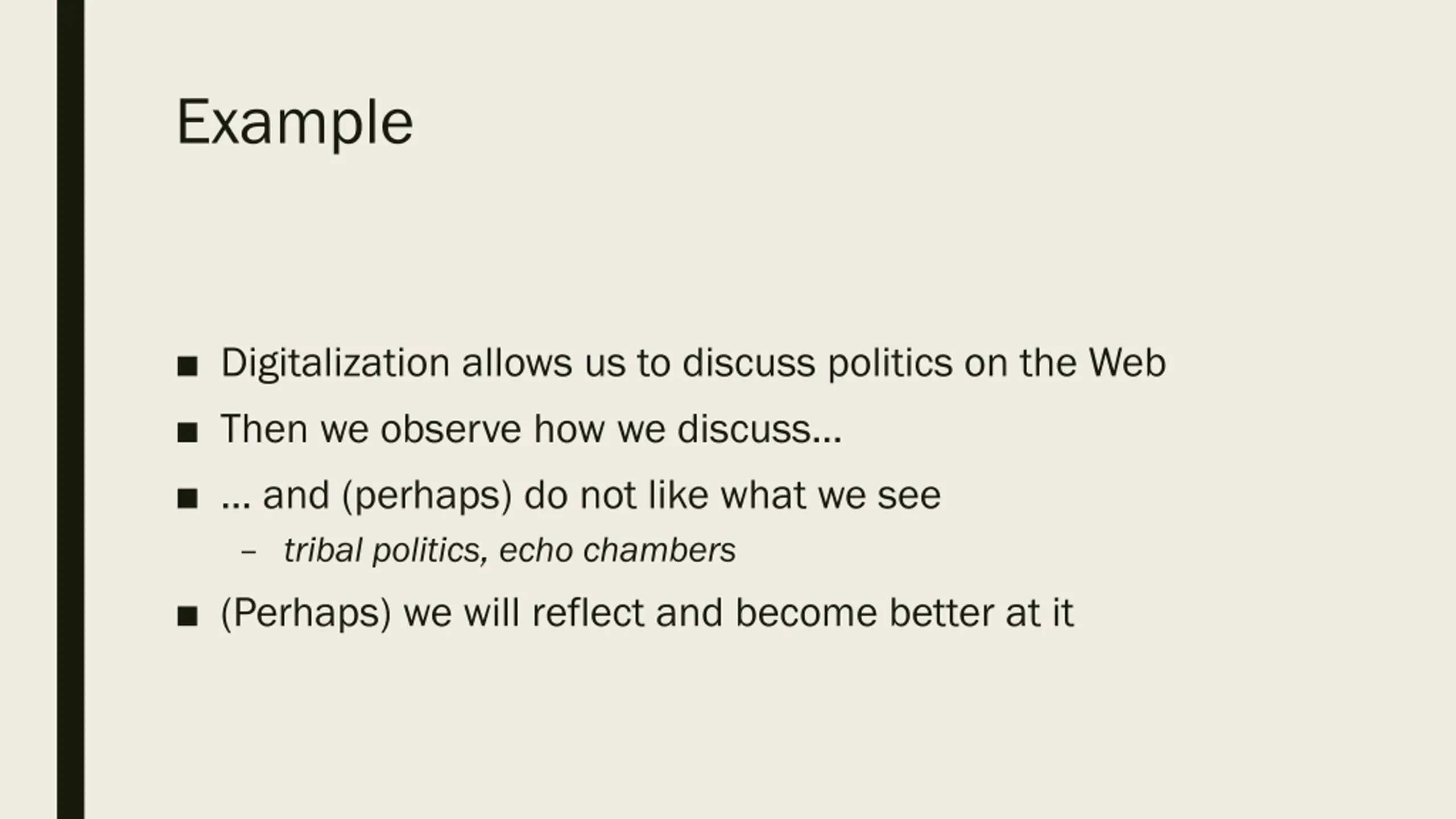 Example Digitalization allows us to discuss politics on the Web Then we observe how we discuss and (perhaps) do not like what we see tribal politics, echo chambers (Perhaps) we will reflect and become better at it