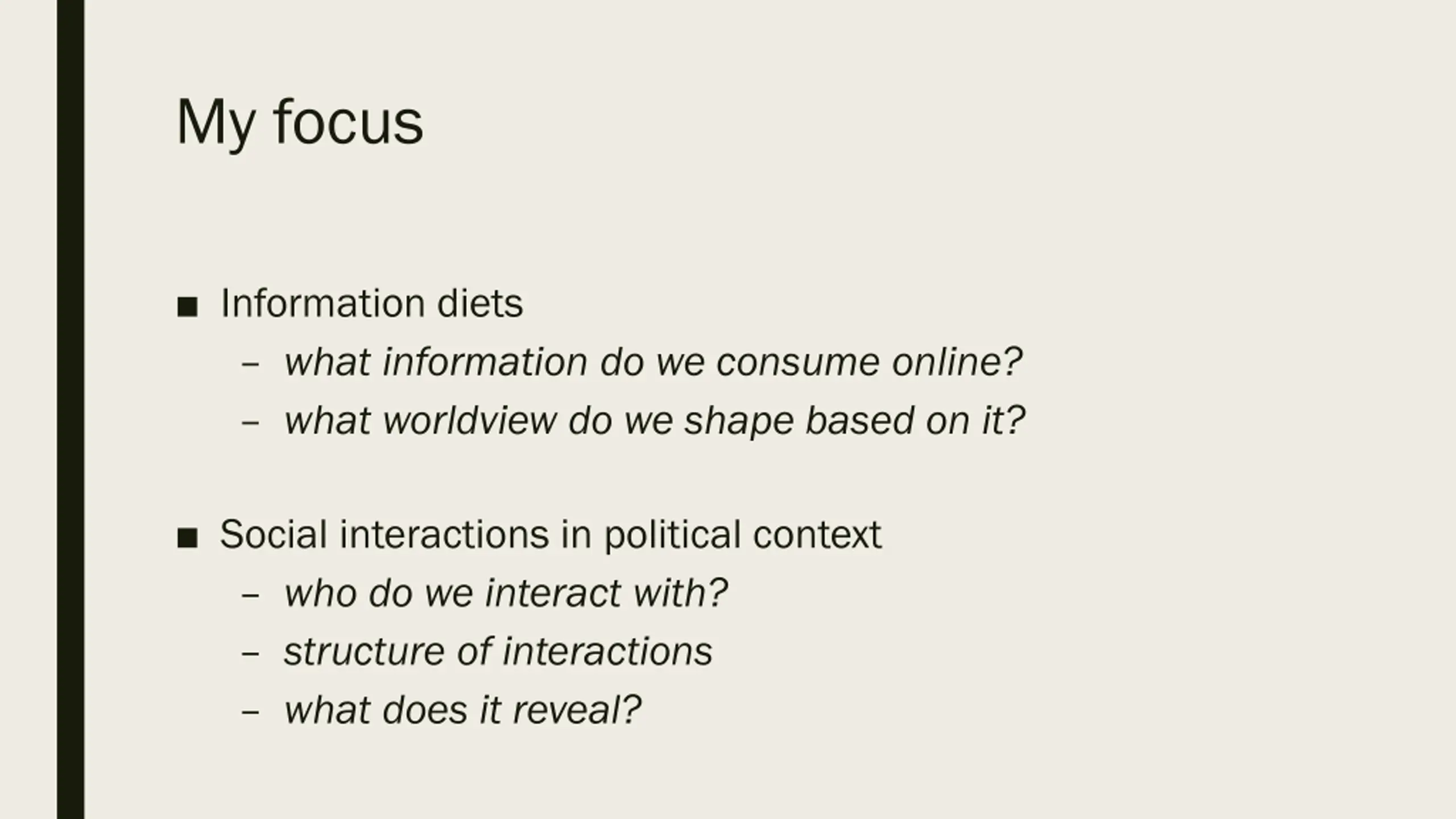 My focus Information diets what information do we consume online? what worldview do we shape based on it? Social interactions in political context who do we interact with? structure of interactions what does it reveal?