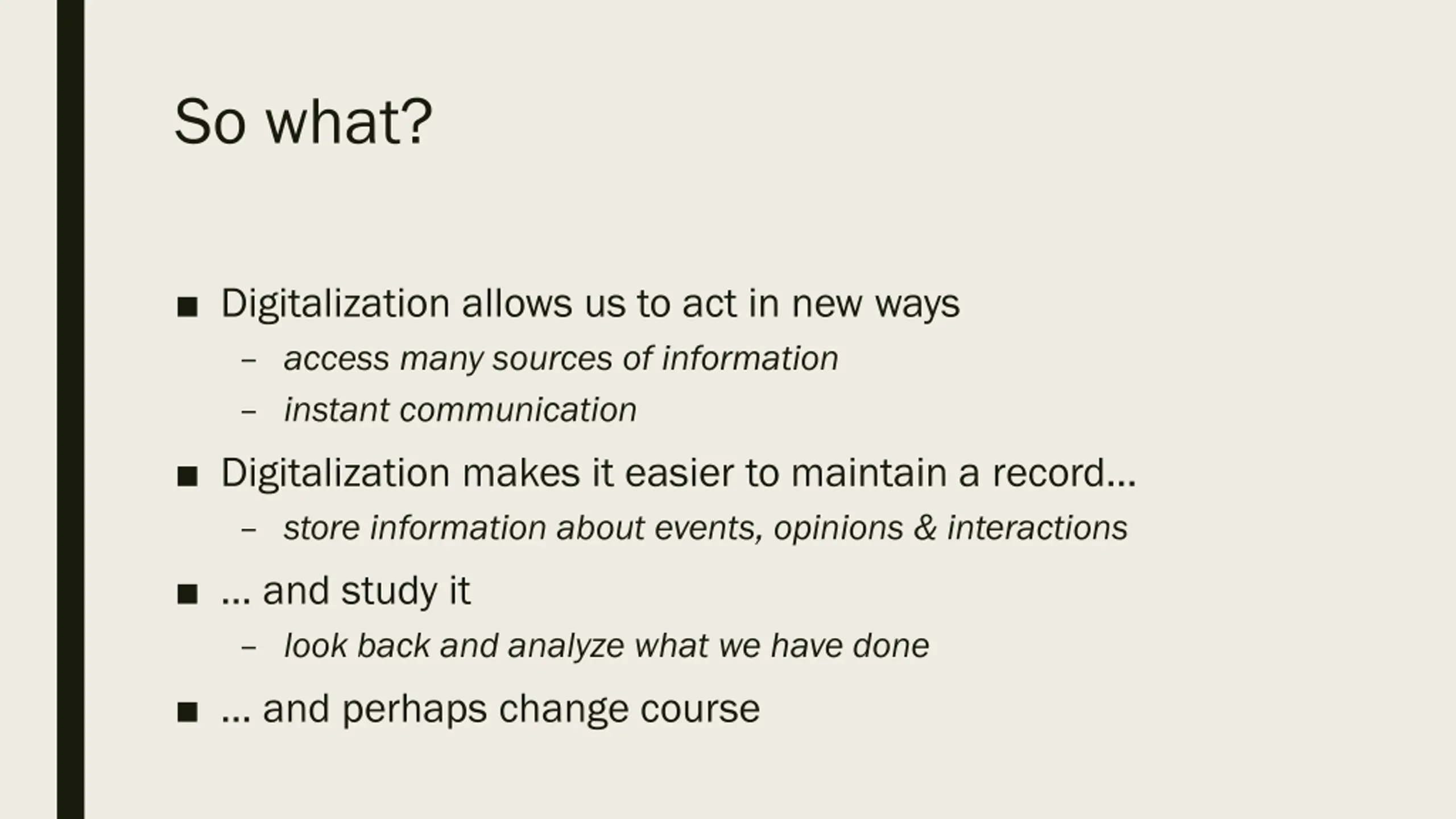 So what? Digitalization allows us to act in new ways access many sources of information instant communication Digitalization makes it easier to maintain a record... store information about events, opinions & interactions and study it look back and analyze what we have done and perhaps change course
