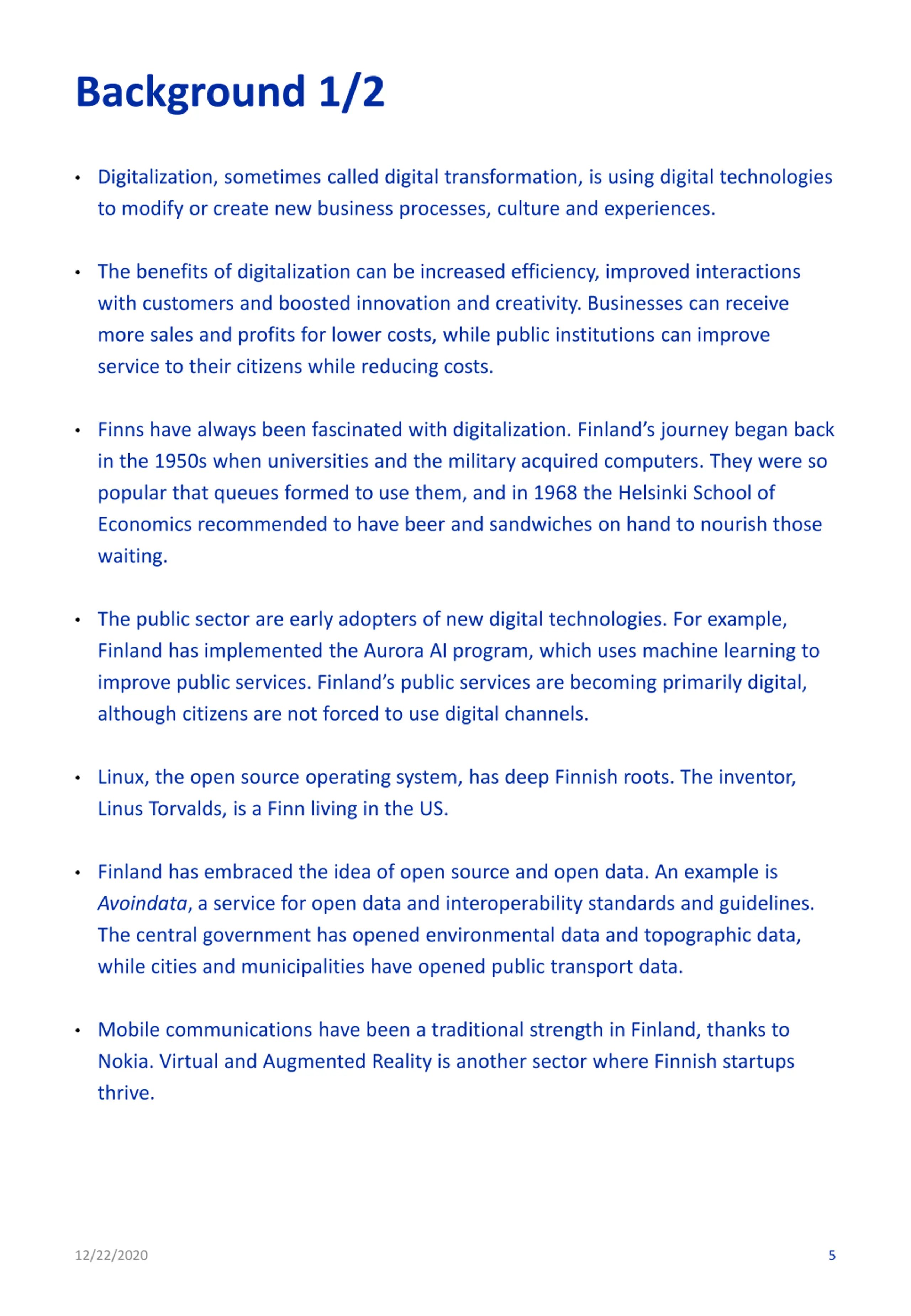 Background 1/2 Digitalization, sometimes called digital transformation, is using digital technologies to modify or create new business processes, culture and experiences. The benefits of digitalization can be increased efficiency, improved interactions with customers and boosted innovation and creativity. Businesses can receive more sales and profits for lower costs, while public institutions can improve service to their citizens while reducing costs. Finns have always been fascinated with digitalization. Finland s journey began back in the 1950s when universities and the military acquired computers. They were so popular that queues formed to use them, and in 1968 the Helsinki School of Economics recommended to have beer and sandwiches on hand to nourish those waiting. The public sector are early adopters of new digital technologies. For example, Finland has implemented the Aurora AI program, which uses machine learning to improve public services. Finland s public services are becoming primarily digital, although citizens are not forced to use digital channels. Linux, the open source operating system, has deep Finnish roots. The inventor, Linus Torvalds, is a Finn living in the US. Finland has embraced the idea of open source and open data. An example is Avoindata, a service for open data and interoperability standards and guidelines. The central government has opened environmental data and topographic data, while cities and municipalities have opened public transport data. Mobile communications have been a traditional strength in Finland, thanks to Nokia. Virtual and Augmented Reality is another sector where Finnish startups thrive. 12/22/2020 5