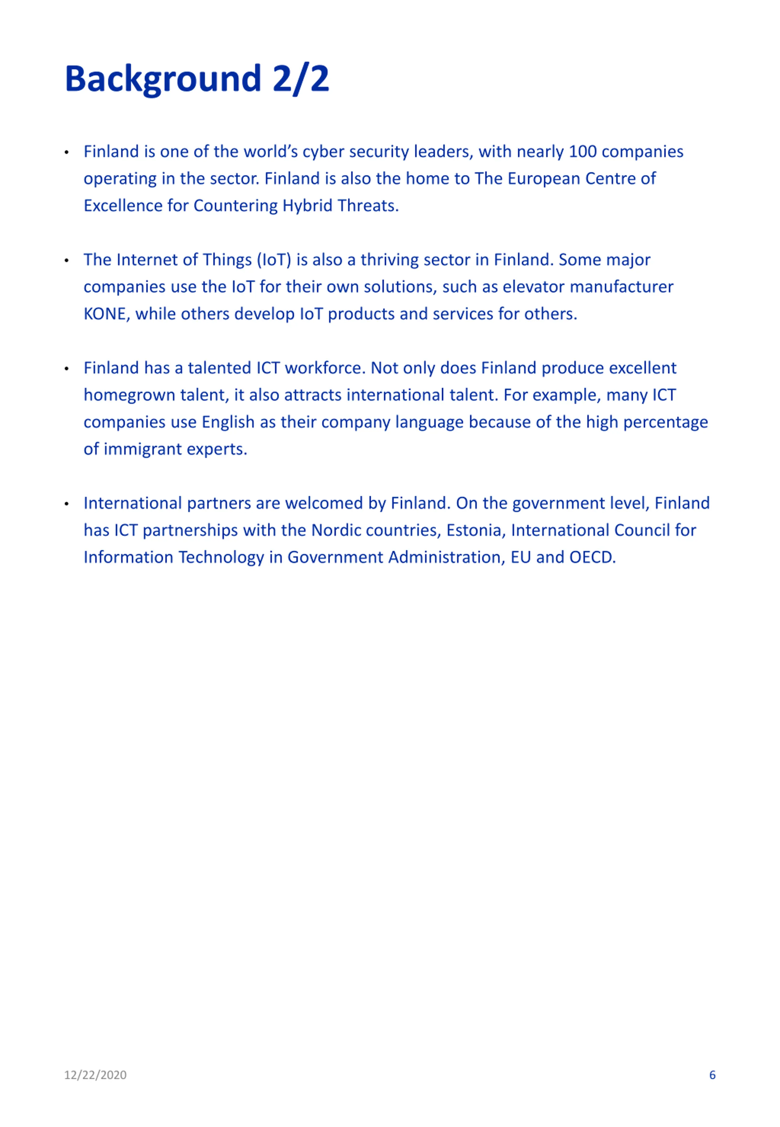 Background 2/2 Finland is one of the world s cyber security leaders, with nearly 100 companies operating in the sector. Finland is also the home to The European Centre of Excellence for Countering Hybrid Threats. The Internet of Things (IoT) is also a thriving sector in Finland. Some major companies use the IoT for their own solutions, such as elevator manufacturer KONE, while others develop IoT products and services for others. Finland has a talented ICT workforce. Not only does Finland produce excellent homegrown talent, it also attracts international talent. For example, many ICT companies use English as their company language because of the high percentage of immigrant experts. International partners are welcomed by Finland. On the government level, Finland has ICT partnerships with the Nordic countries, Estonia, International Council for Information Technology in Government Administration, EU and OECD. 12/22/2020 6