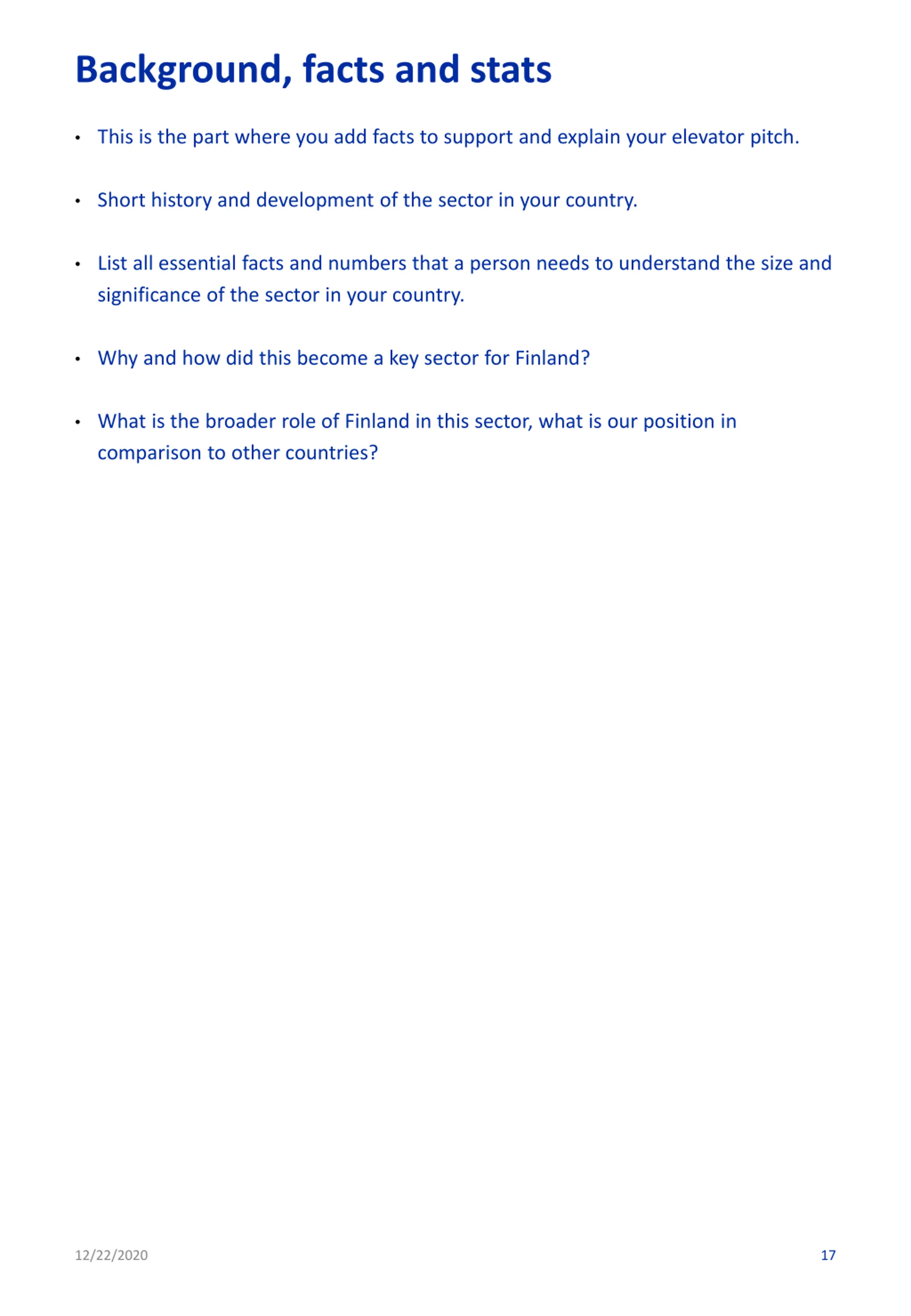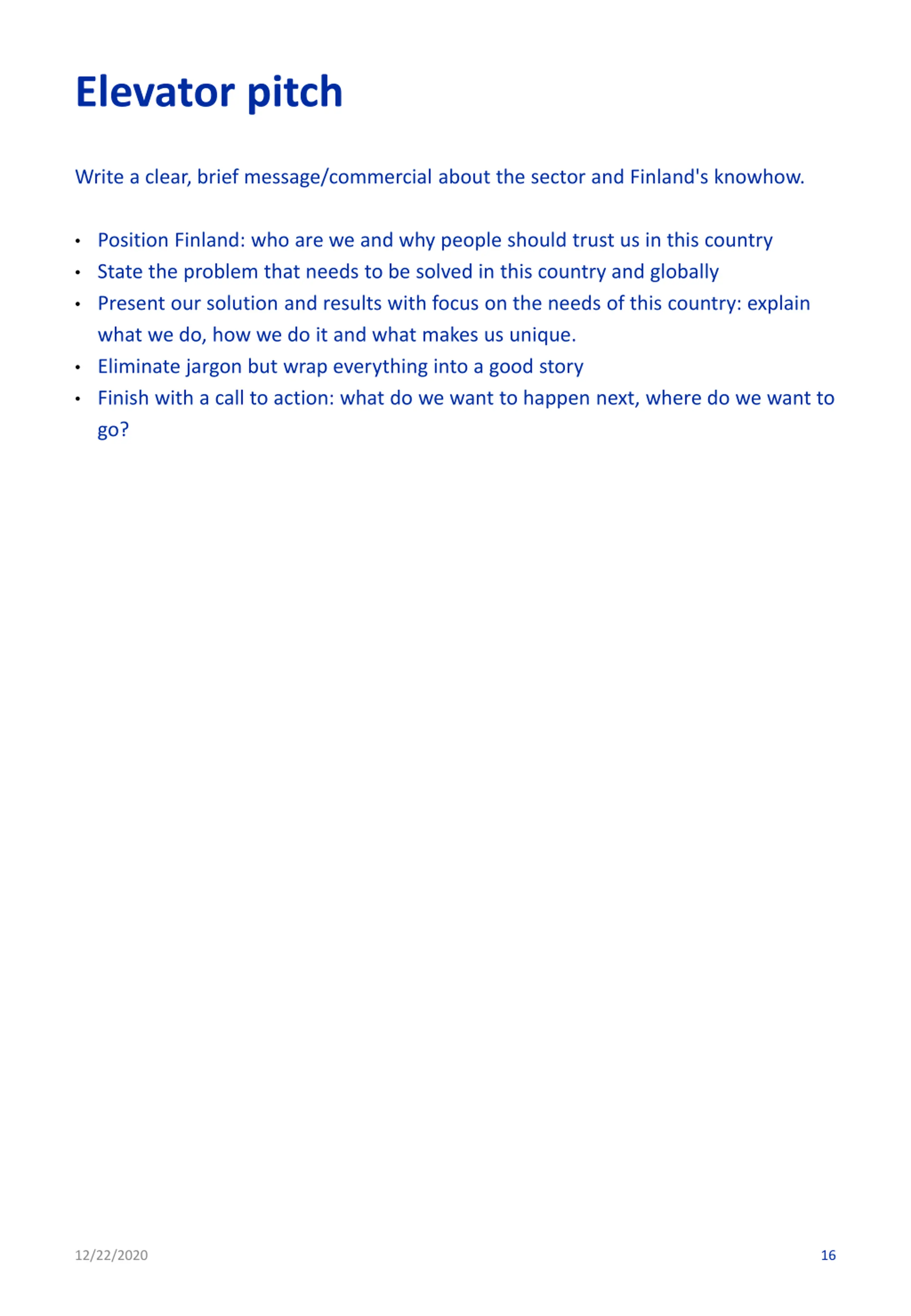 Elevator pitch Write a clear, brief message/commercial about the sector and Finland's knowhow. Position Finland: who are we and why people should trust us in this country State the problem that needs to be solved in this country and globally Present our solution and results with focus on the needs of this country: explain what we do, how we do it and what makes us unique. Eliminate jargon but wrap everything into a good story Finish with a call to action: what do we want to happen next, where do we want to go? 12/22/2020 16
