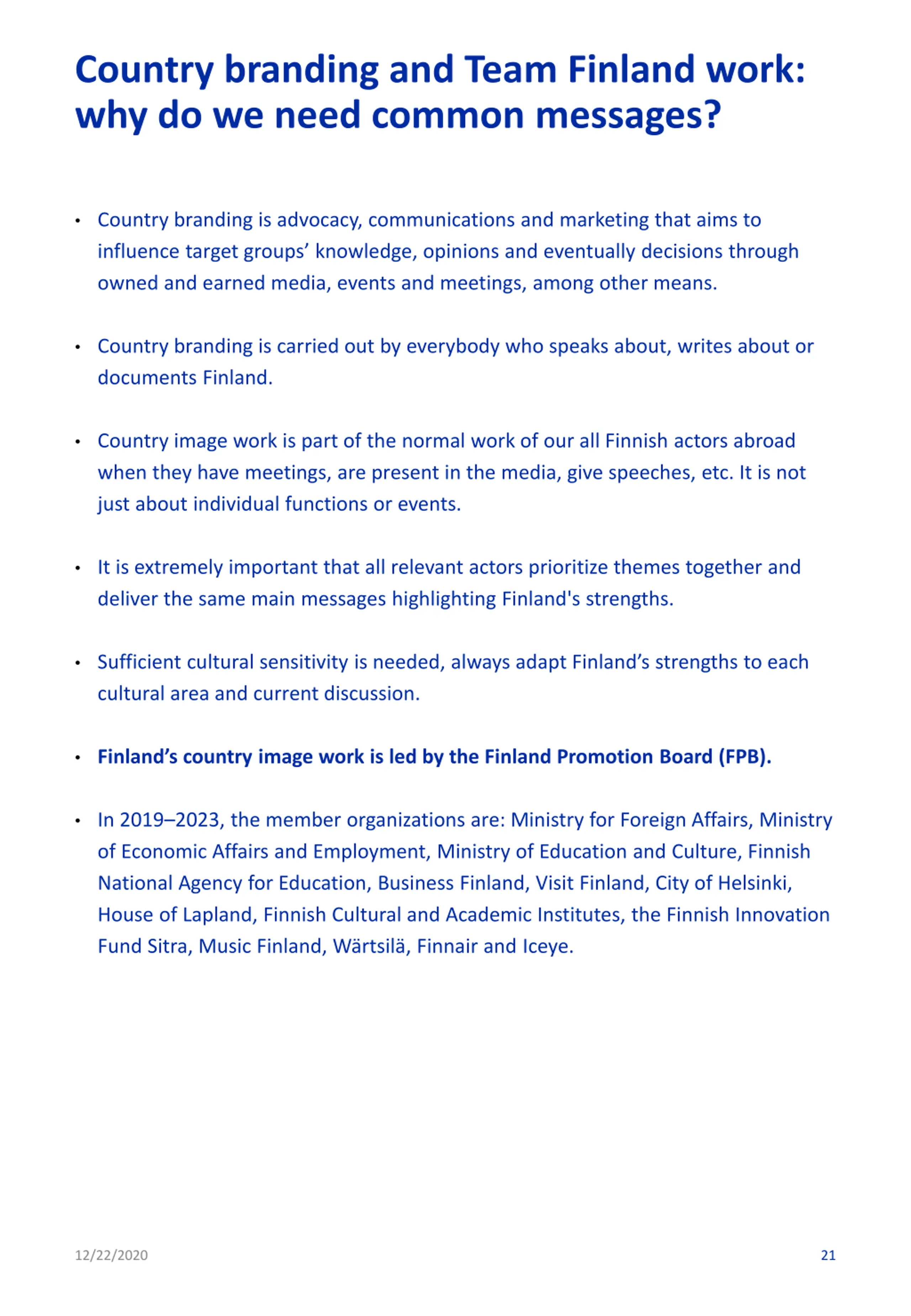 Country branding and Team Finland work: why do we need common messages? Country branding is advocacy, communications and marketing that aims to influence target groups knowledge, opinions and eventually decisions through owned and earned media, events and meetings, among other means. Country branding is carried out by everybody who speaks about, writes about or documents Finland. Country image work is part of the normal work of our all Finnish actors abroad when they have meetings, are present in the media, give speeches, etc. It is not just about individual functions or events. It is extremely important that all relevant actors prioritize themes together and deliver the same main messages highlighting Finland's strengths. Sufficient cultural sensitivity is needed, always adapt Finland s strengths to each cultural area and current discussion. Finland s country image work is led by the Finland Promotion Board (FPB). In 2019 2023, the member organizations are: Ministry for Foreign Affairs, Ministry of Economic Affairs and Employment, Ministry of Education and Culture, Finnish National Agency for Education, Business Finland, Visit Finland, City of Helsinki, House of Lapland, Finnish Cultural and Academic Institutes, the Finnish Innovation Fund Sitra, Music Finland, W rtsil , Finnair and Iceye. 12/22/2020 21