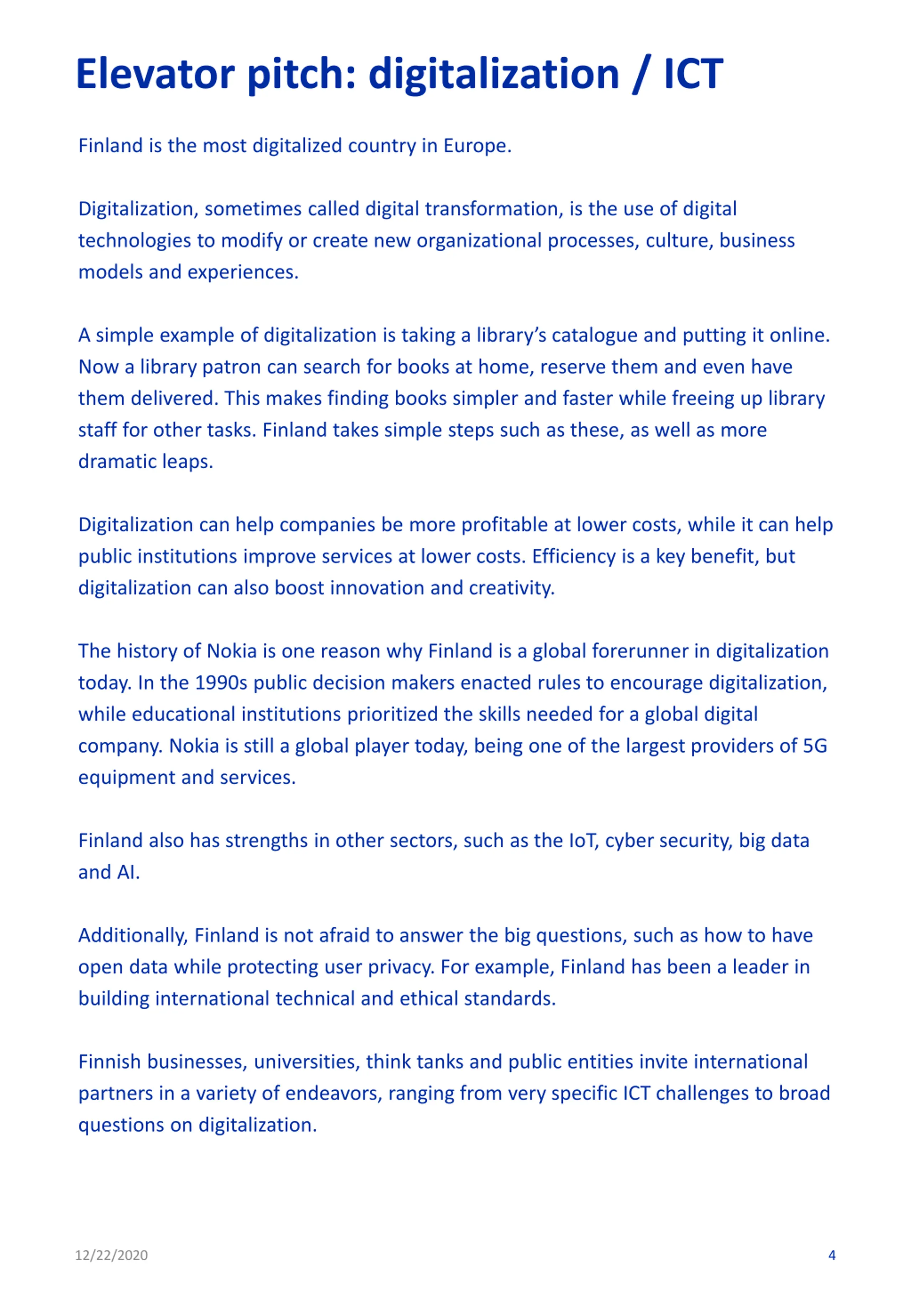 Elevator pitch: digitalization / ICT Finland is the most digitalized country in Europe. Digitalization, sometimes called digital transformation, is the use of digital technologies to modify or create new organizational processes, culture, business models and experiences. A simple example of digitalization is taking a library s catalogue and putting it online. Now a library patron can search for books at home, reserve them and even have them delivered. This makes finding books simpler and faster while freeing up library staff for other tasks. Finland takes simple steps such as these, as well as more dramatic leaps. Digitalization can help companies be more profitable at lower costs, while it can help public institutions improve services at lower costs. Efficiency is a key benefit, but digitalization can also boost innovation and creativity. The history of Nokia is one reason why Finland is a global forerunner in digitalization today. In the 1990s public decision makers enacted rules to encourage digitalization, while educational institutions prioritized the skills needed for a global digital company. Nokia is still a global player today, being one of the largest providers of 5G equipment and services. Finland also has strengths in other sectors, such as the IoT, cyber security, big data and AI. Additionally, Finland is not afraid to answer the big questions, such as how to have open data while protecting user privacy. For example, Finland has been a leader in building international technical and ethical standards. Finnish businesses, universities, think tanks and public entities invite international partners in a variety of endeavors, ranging from very specific ICT challenges to broad questions on digitalization. 12/22/2020 4