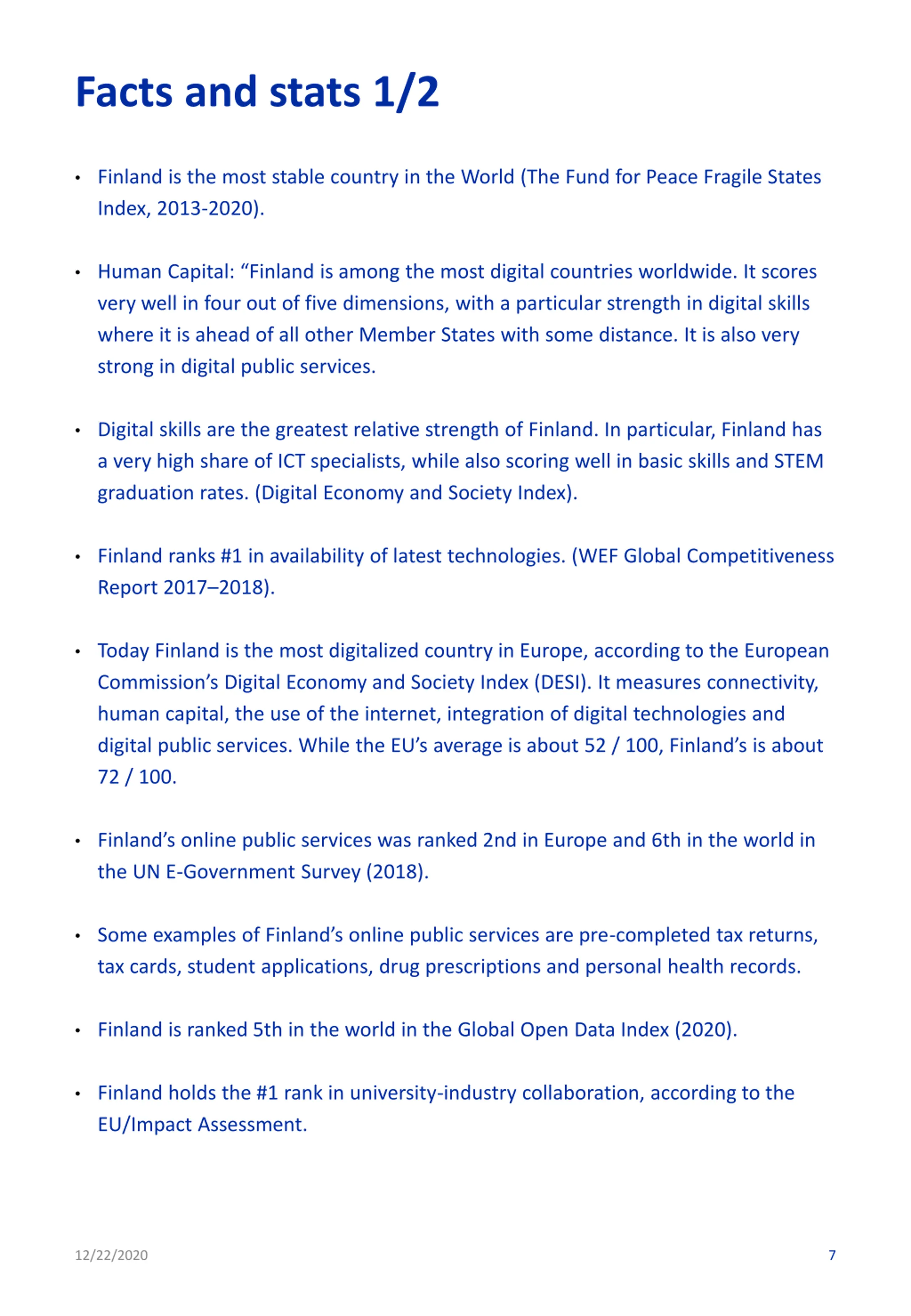 Facts and stats 1/2 Finland is the most stable country in the World (The Fund for Peace Fragile States Index, 2013-2020). Human Capital: Finland is among the most digital countries worldwide. It scores very well in four out of five dimensions, with a particular strength in digital skills where it is ahead of all other Member States with some distance. It is also very strong in digital public services. Digital skills are the greatest relative strength of Finland. In particular, Finland has a very high share of ICT specialists, while also scoring well in basic skills and STEM graduation rates. (Digital Economy and Society Index). Finland ranks #1 in availability of latest technologies. (WEF Global Competitiveness Report 2017 2018). Today Finland is the most digitalized country in Europe, according to the European Commission s Digital Economy and Society Index (DESI). It measures connectivity, human capital, the use of the internet, integration of digital technologies and digital public services. While the EU s average is about 52 / 100, Finland s is about 72 / 100. Finland s online public services was ranked 2nd in Europe and 6th in the world in the UN E-Government Survey (2018). Some examples of Finland s online public services are pre-completed tax returns, tax cards, student applications, drug prescriptions and personal health records. Finland is ranked 5th in the world in the Global Open Data Index (2020). Finland holds the #1 rank in university-industry collaboration, according to the EU/Impact Assessment. 12/22/2020 7