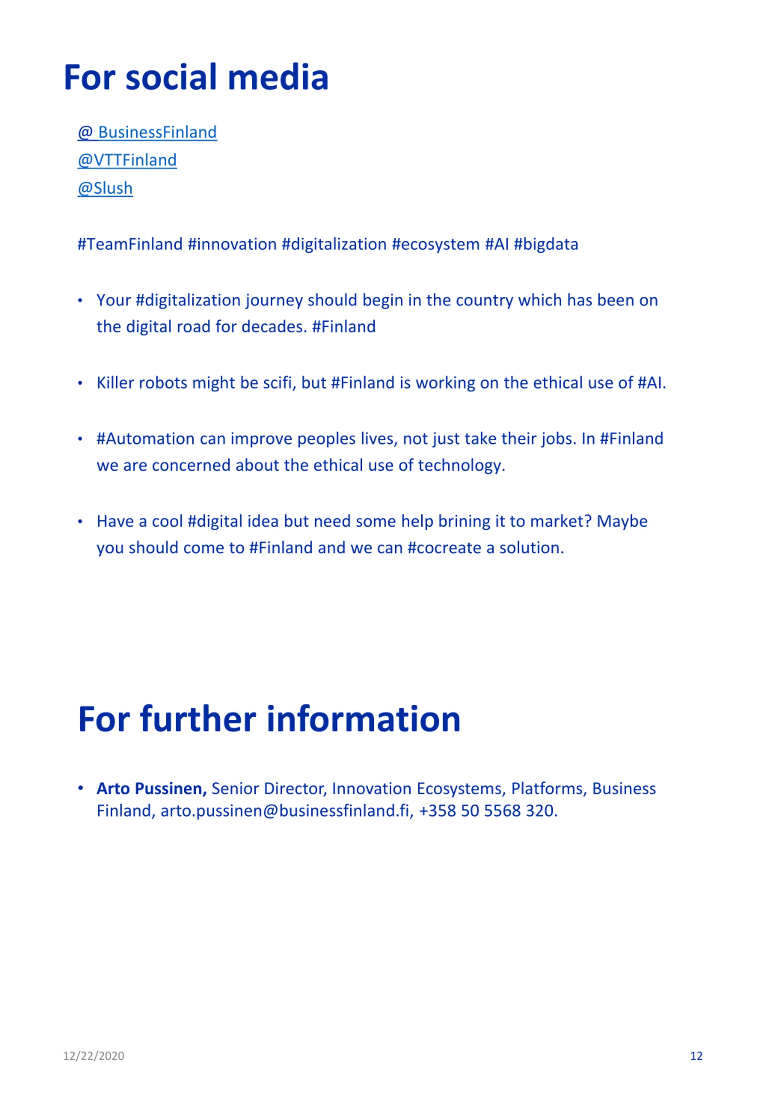 For social media @ BusinessFinland @VTTFinland @Slush #TeamFinland #innovation #digitalization #ecosystem #AI #bigdata Your #digitalization journey should begin in the country which has been on the digital road for decades. #Finland Killer robots might be scifi, but #Finland is working on the ethical use of #AI. #Automation can improve peoples lives, not just take their jobs. In #Finland we are concerned about the ethical use of technology. Have a cool #digital idea but need some help brining it to market? Maybe you should come to #Finland and we can #cocreate a solution. For further information Arto Pussinen, Senior Director, Innovation Ecosystems, Platforms, Business Finland, arto.pussinen@businessfinland.fi, +358 50 5568 320. 12/22/2020 12
