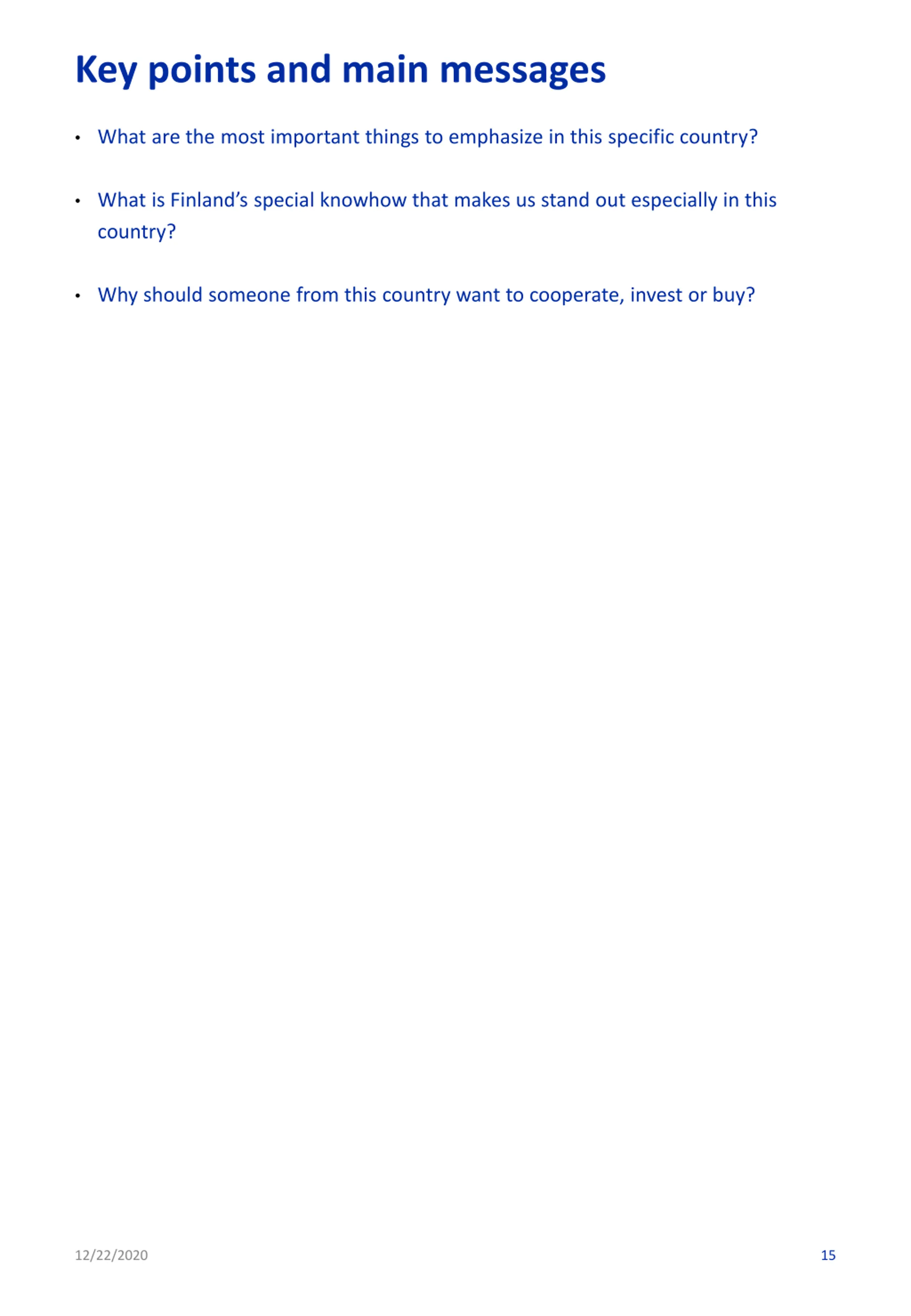 Key points and main messages What are the most important things to emphasize in this specific country? What is Finland s special knowhow that makes us stand out especially in this country? Why should someone from this country want to cooperate, invest or buy? 12/22/2020 15