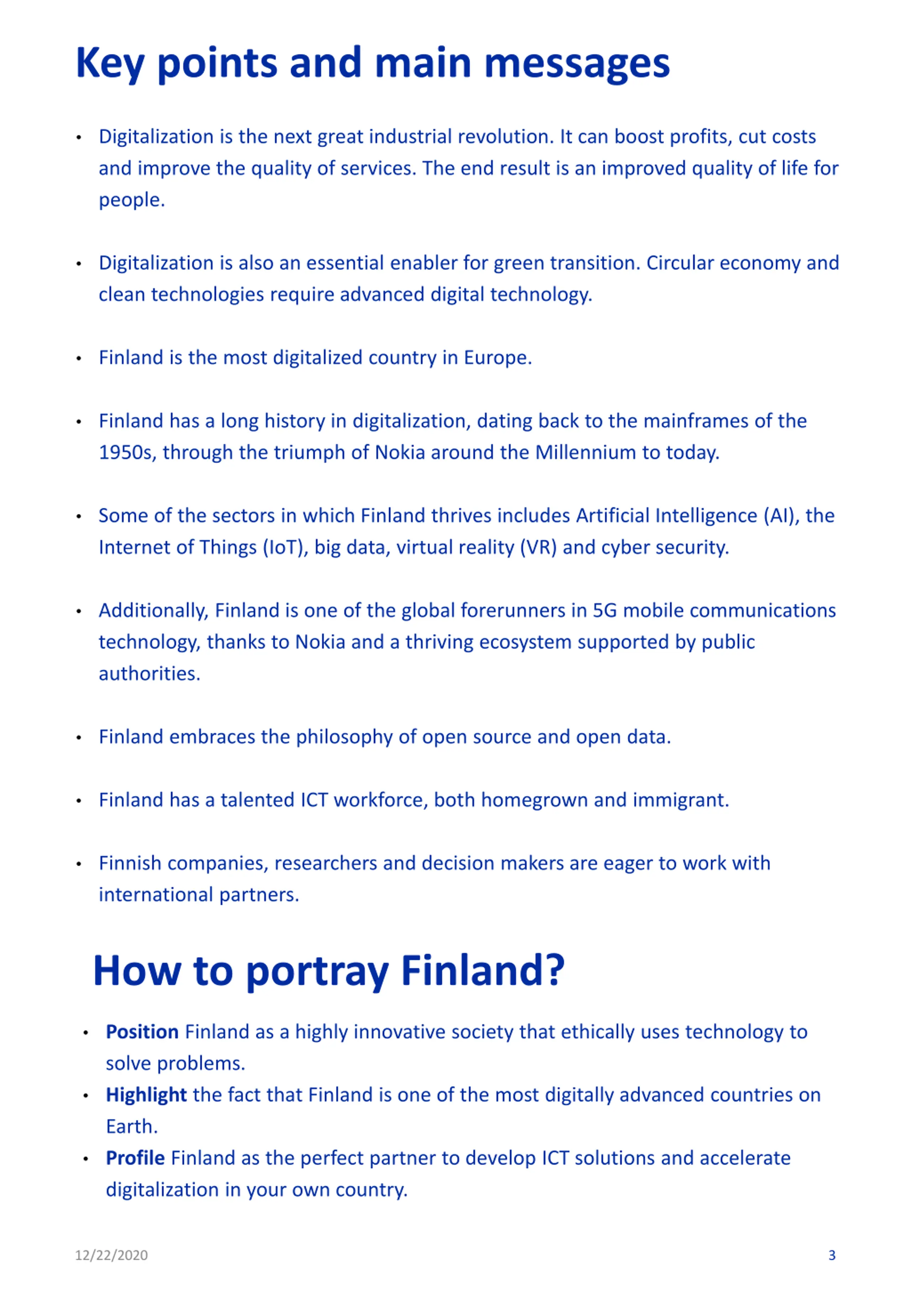 Key points and main messages Digitalization is the next great industrial revolution. It can boost profits, cut costs and improve the quality of services. The end result is an improved quality of life for people. Digitalization is also an essential enabler for green transition. Circular economy and clean technologies require advanced digital technology. Finland is the most digitalized country in Europe. Finland has a long history in digitalization, dating back to the mainframes of the 1950s, through the triumph of Nokia around the Millennium to today. Some of the sectors in which Finland thrives includes Artificial Intelligence (AI), the Internet of Things (IoT), big data, virtual reality (VR) and cyber security. Additionally, Finland is one of the global forerunners in 5G mobile communications technology, thanks to Nokia and a thriving ecosystem supported by public authorities. Finland embraces the philosophy of open source and open data. Finland has a talented ICT workforce, both homegrown and immigrant. Finnish companies, researchers and decision makers are eager to work with international partners. How to portray Finland? Position Finland as a highly innovative society that ethically uses technology to solve problems. Highlight the fact that Finland is one of the most digitally advanced countries on Earth. Profile Finland as the perfect partner to develop ICT solutions and accelerate digitalization in your own country. 12/22/2020 3